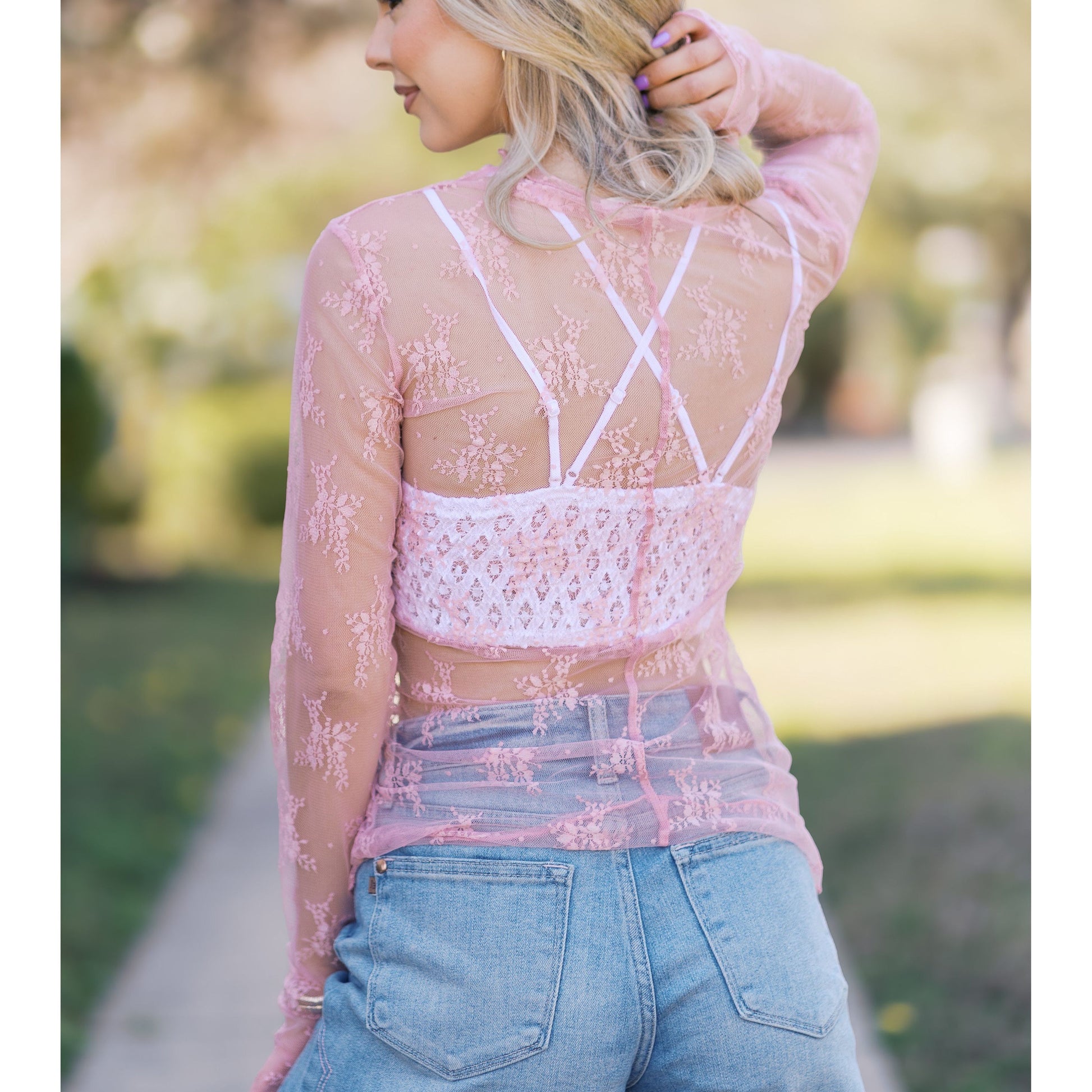 Wrap yourself in our Pink Lace Embrace Top made of soft, lightweight lace mesh fabric. Its high neck design and slim fit will keep you stylish and comfortable. Perfect for any occasion, this top comes with long sleeves and doesn't include a lining (bralette not included). Get ready to embrace the lace!!