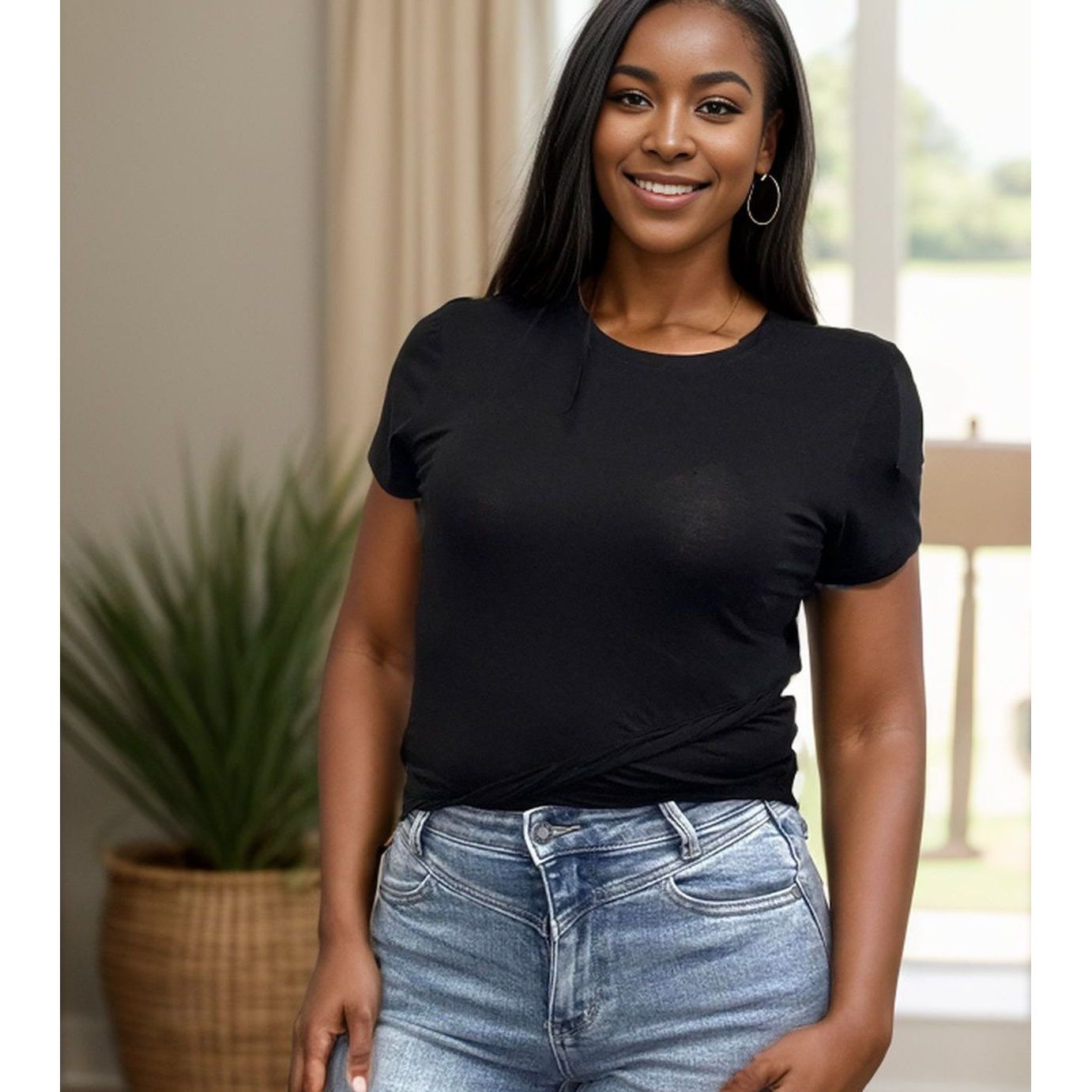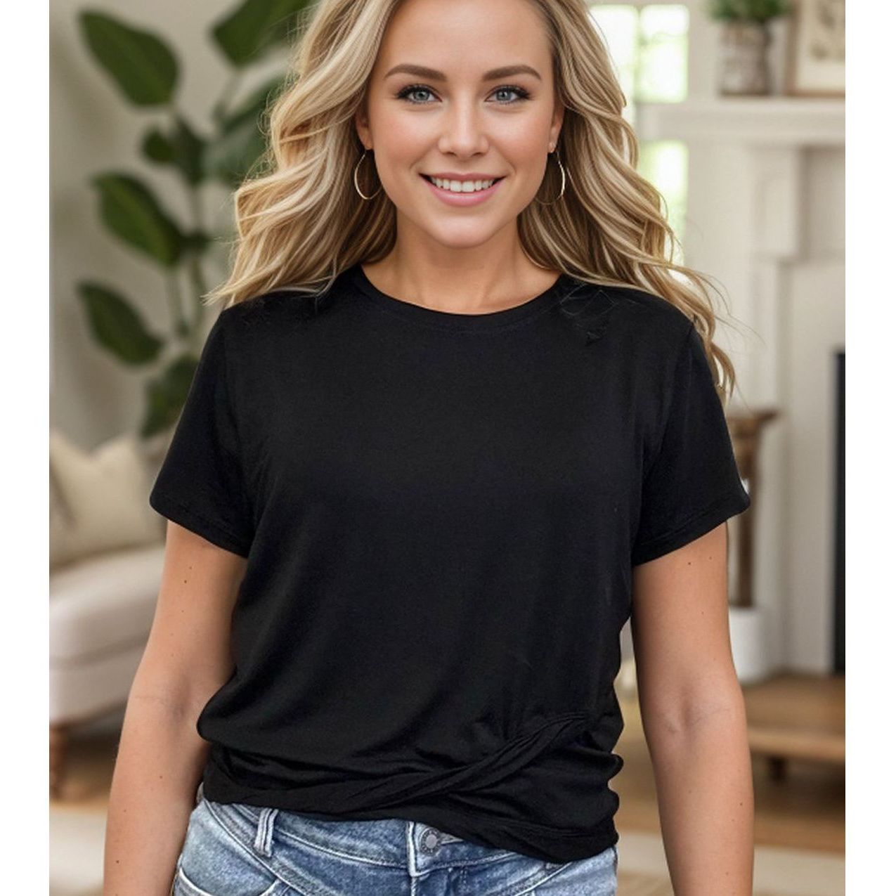 This top has everything you need (get it?) - a stylish trimming edge, cropped design, and flattering short sleeves. A versatile addition to any wardrobe, it's the perfect choice for an effortlessly cool and playful look. Say hello to your new go-to top!