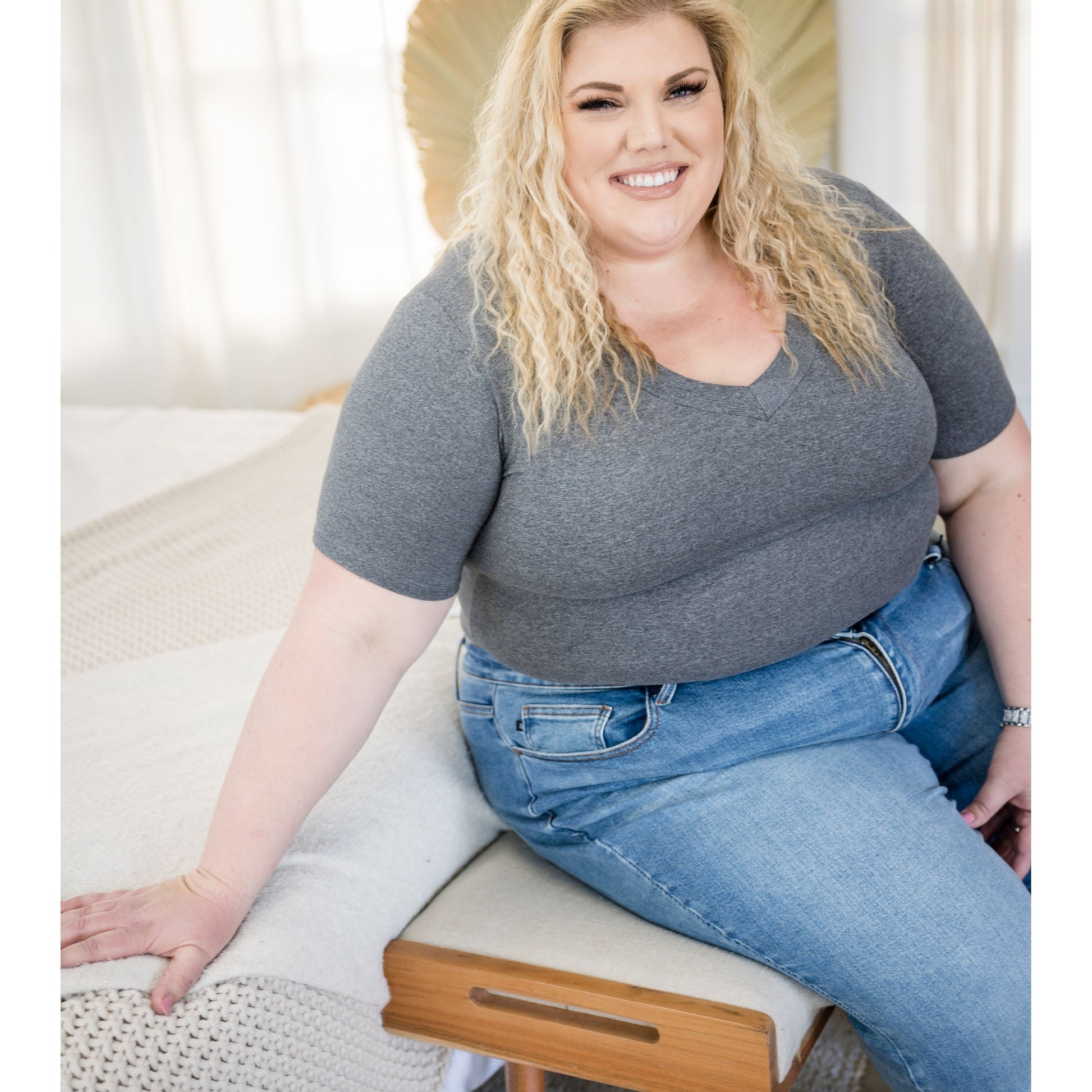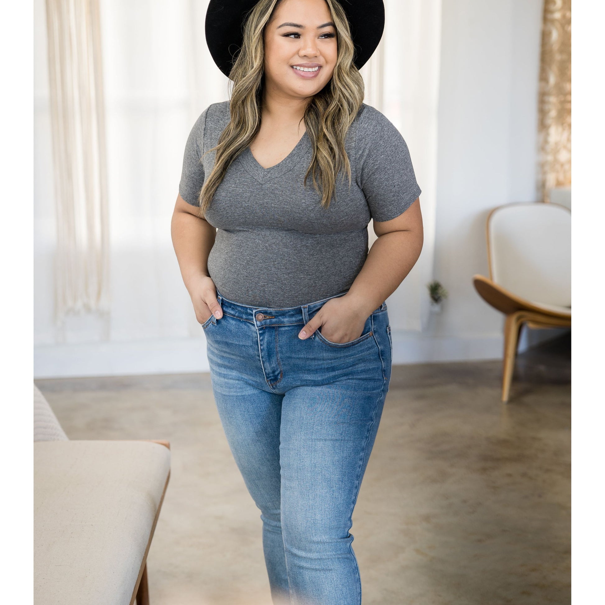 Whatever you decide to pair this buttery soft bodysuit with, you will be all put together! Bodysuits give you the perfect tuck, they are amazing to layer with, and they look great with just about any type of bottom (Jeans, Shorts, Skirts). With a fitted silhouette, this top features a v-neck, short sleeves and snap enclosure.