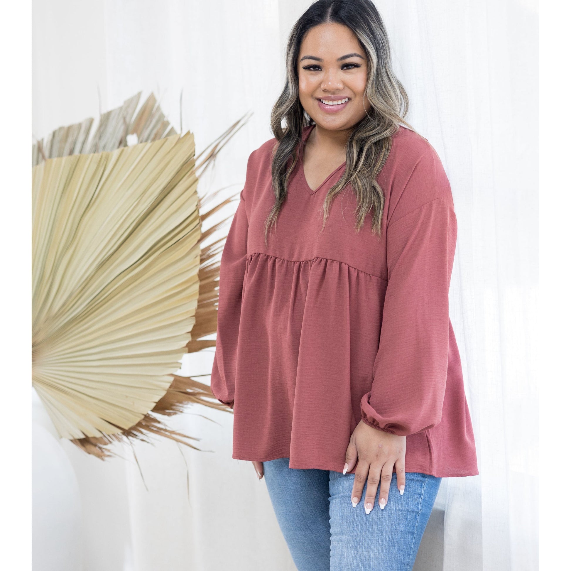 This marsala, boho inspired babydoll is the perfect year round piece. With a relaxed fit, this top features a v-neck, long balloon sleeves and peplum waist.