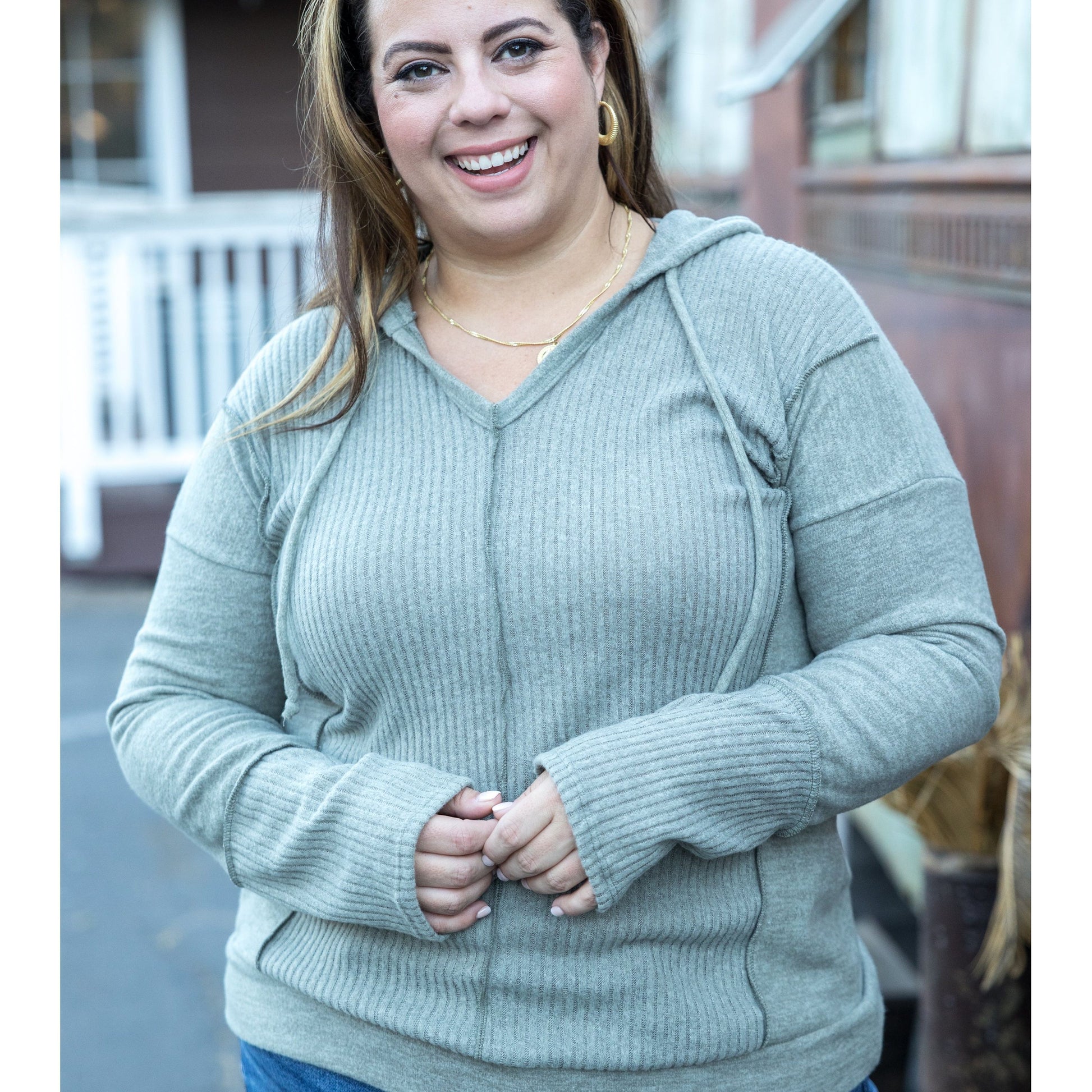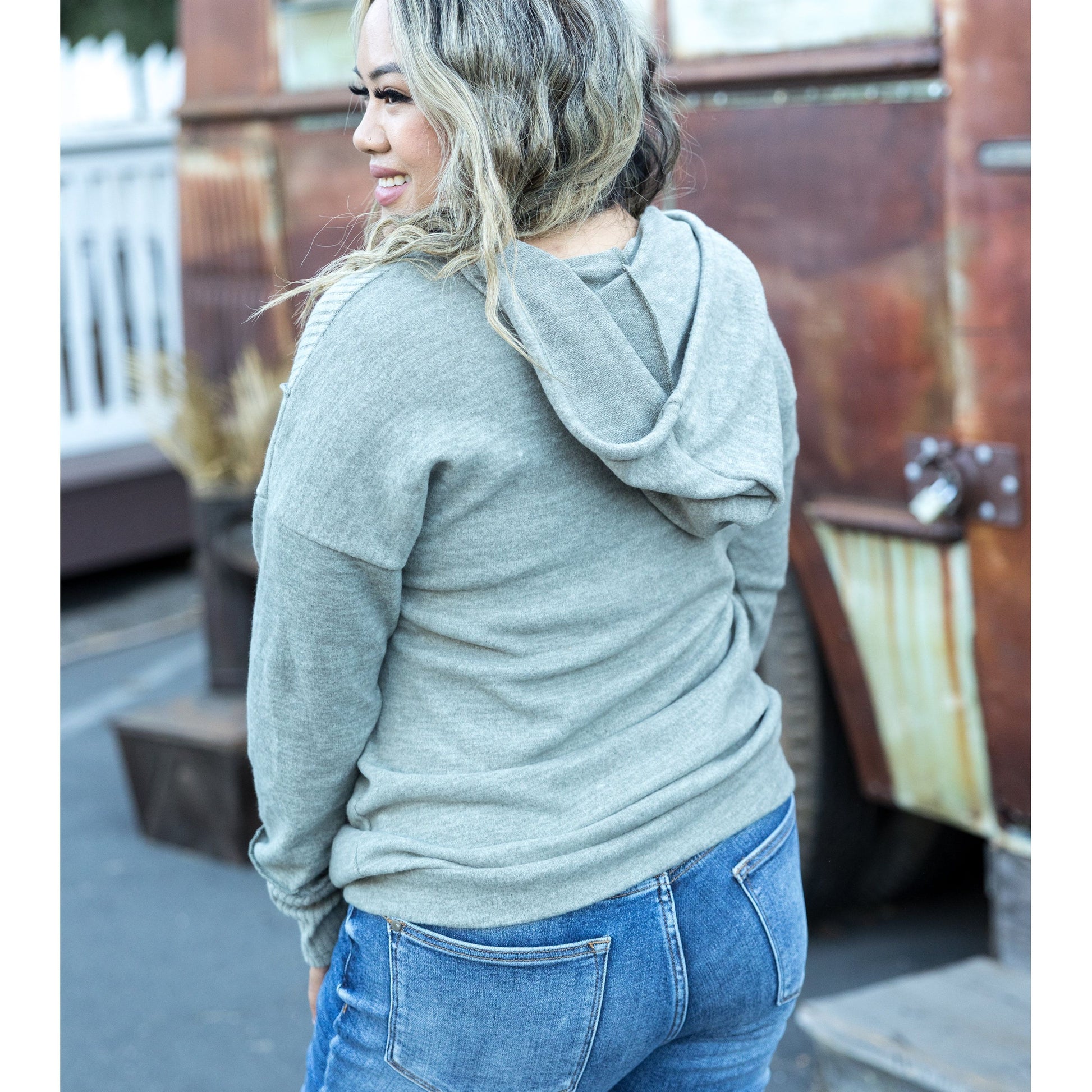 We are loving the texture mix in this ultra soft brushed hacci hoodie. The solid and rib contrast gives so much dimension to this solid top and the comfort is to die for! With a relaxed fit, this hoodie features a v-neck, functioning draw-stings, long sleeves and banded hem.