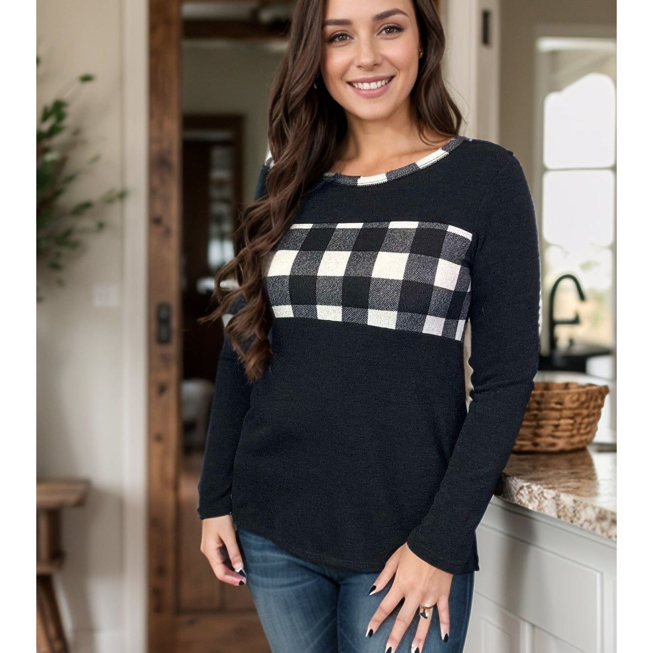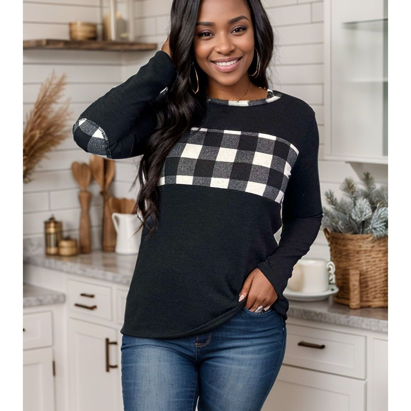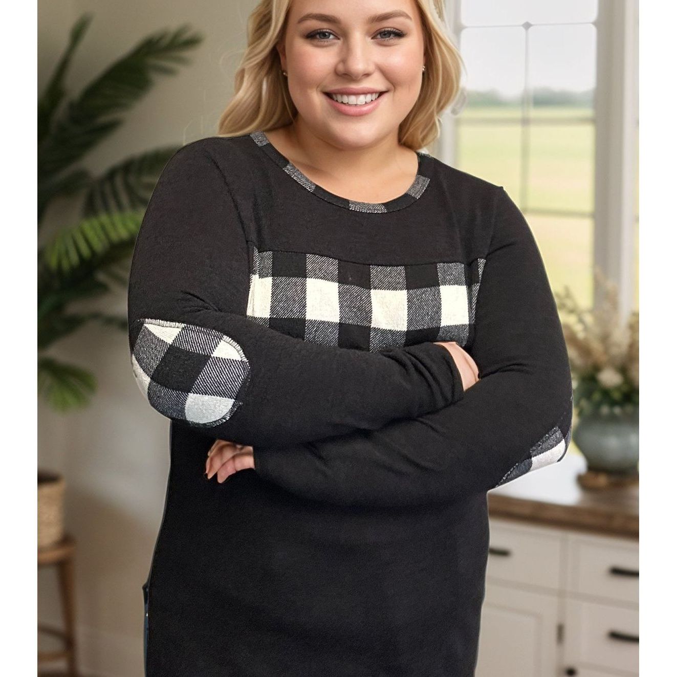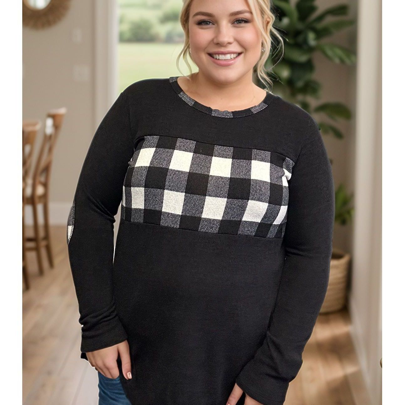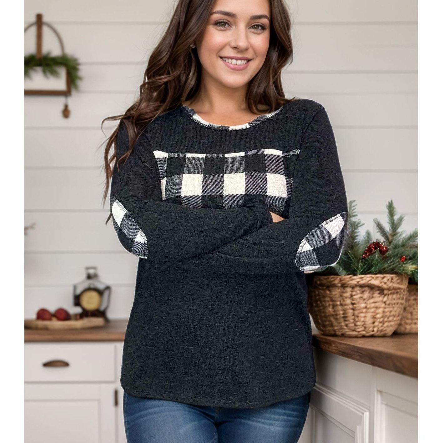 Get ready to conquer the fashion game with the Checkmate Pullover! Made from a cozy hacci sweater knit, this pullover features a round neckline, stylish plaid and black colorblock design, and playful elbow patches. Plus, the plaid trim on the neckline adds a playful touch. Checkmate your fashion opponents today!