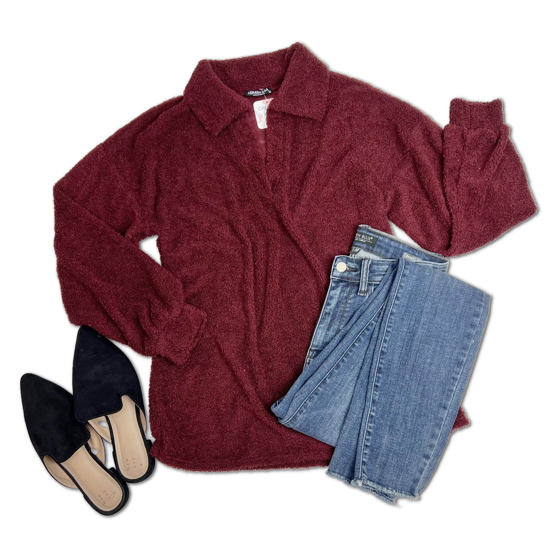 Indulge in the ultimate comfort and warmth with Completely Irresistible - Sweater Gabby. Its sherpa material guarantees cozy vibes while its v-neck and collar add a touch of style. Long sleeves provide just the right amount of coverage, and the wine color is a definite showstopper. Get ready to turn heads and stay toasty!