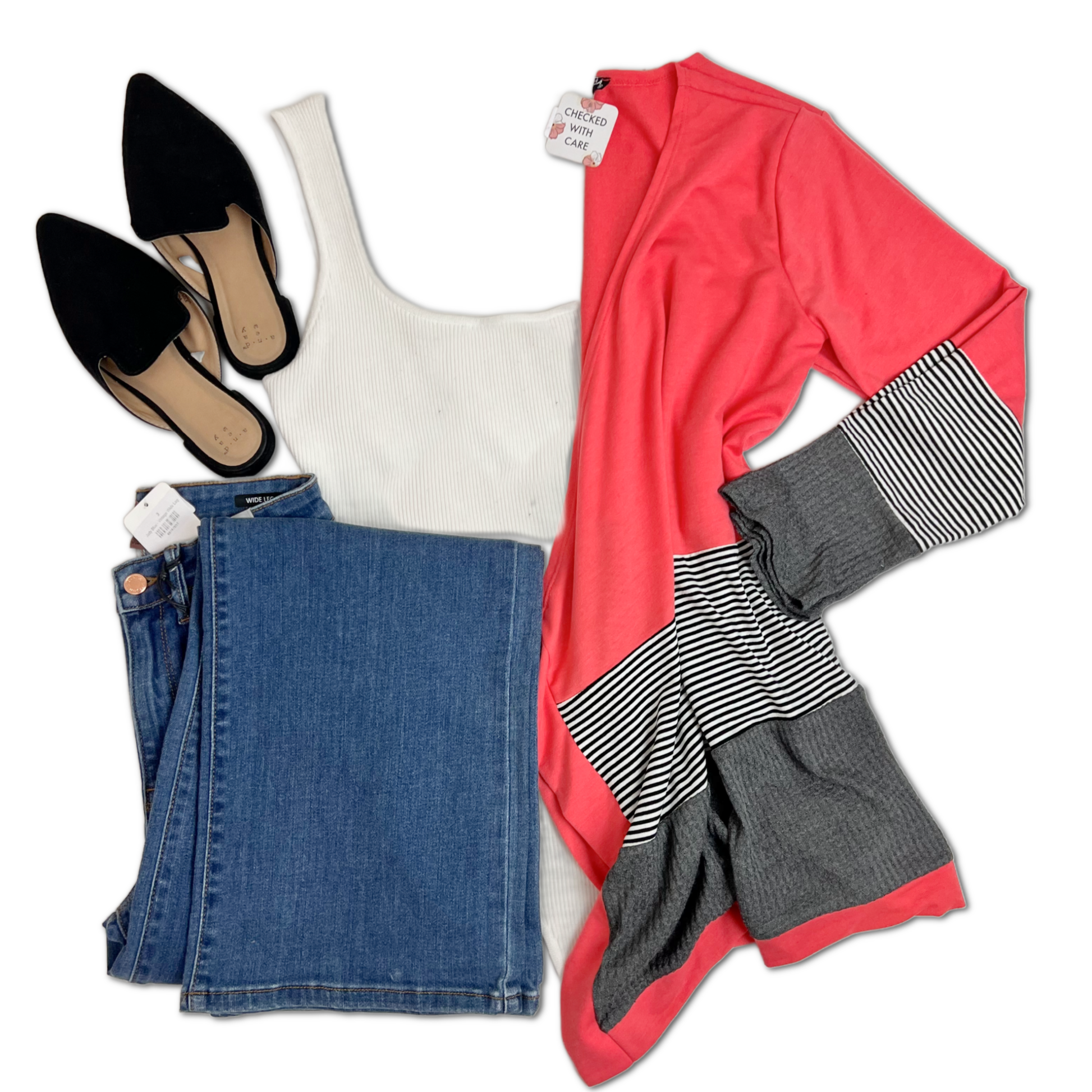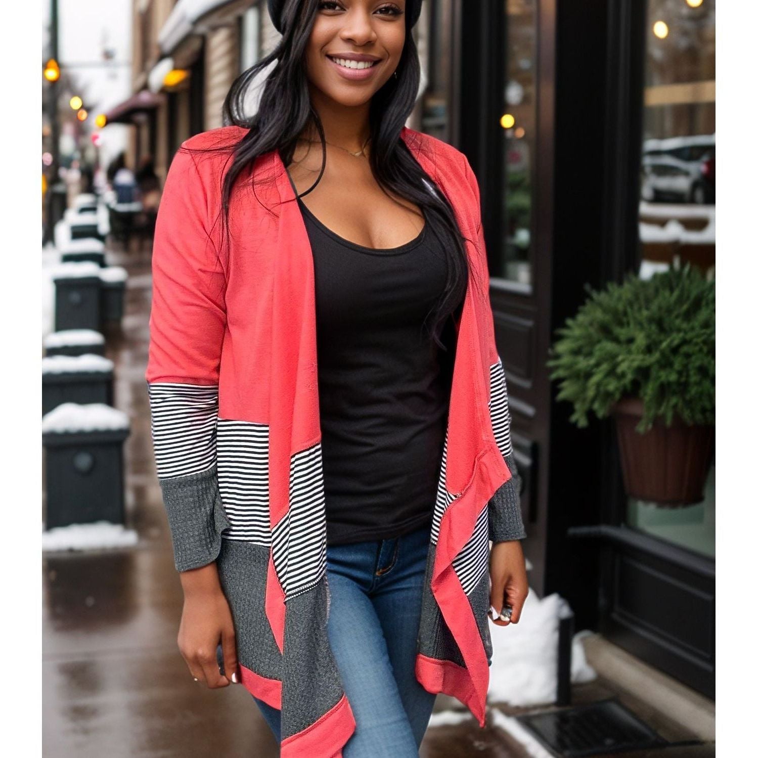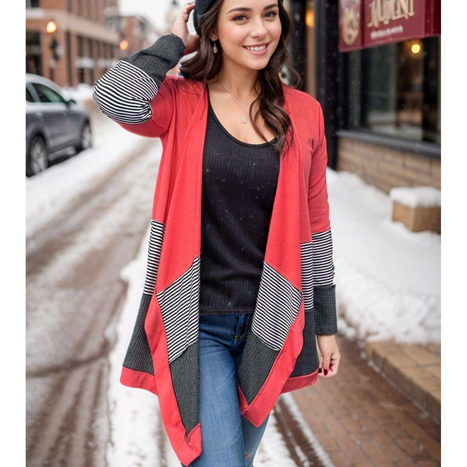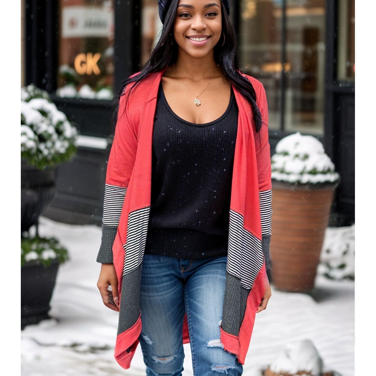 Upgrade your wardrobe with the CoralScapes cardigan! Embrace the playful drape, cascading front, and colorblock design, perfect for layering in any season. With long sleeves and an open face, this cardigan offers versatility and style. The solid and stripe contrast adds a touch of quirk and uniqueness. (Get ready for compliments!)