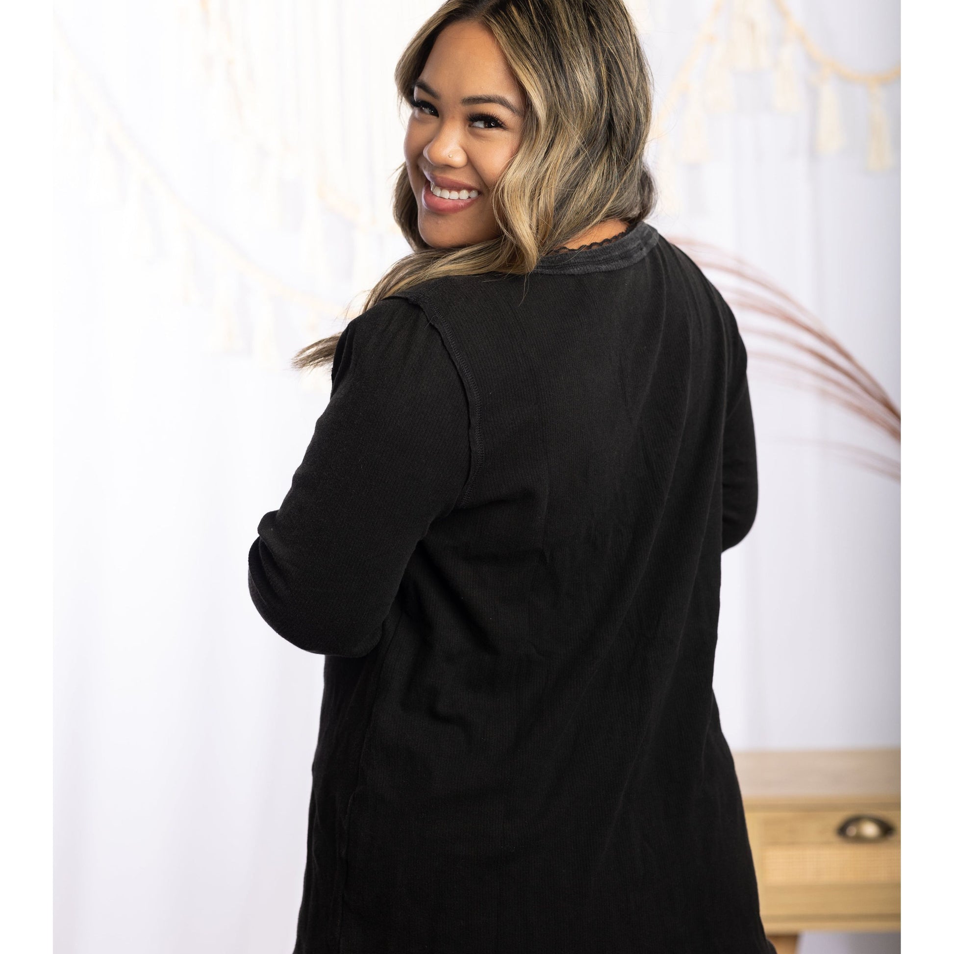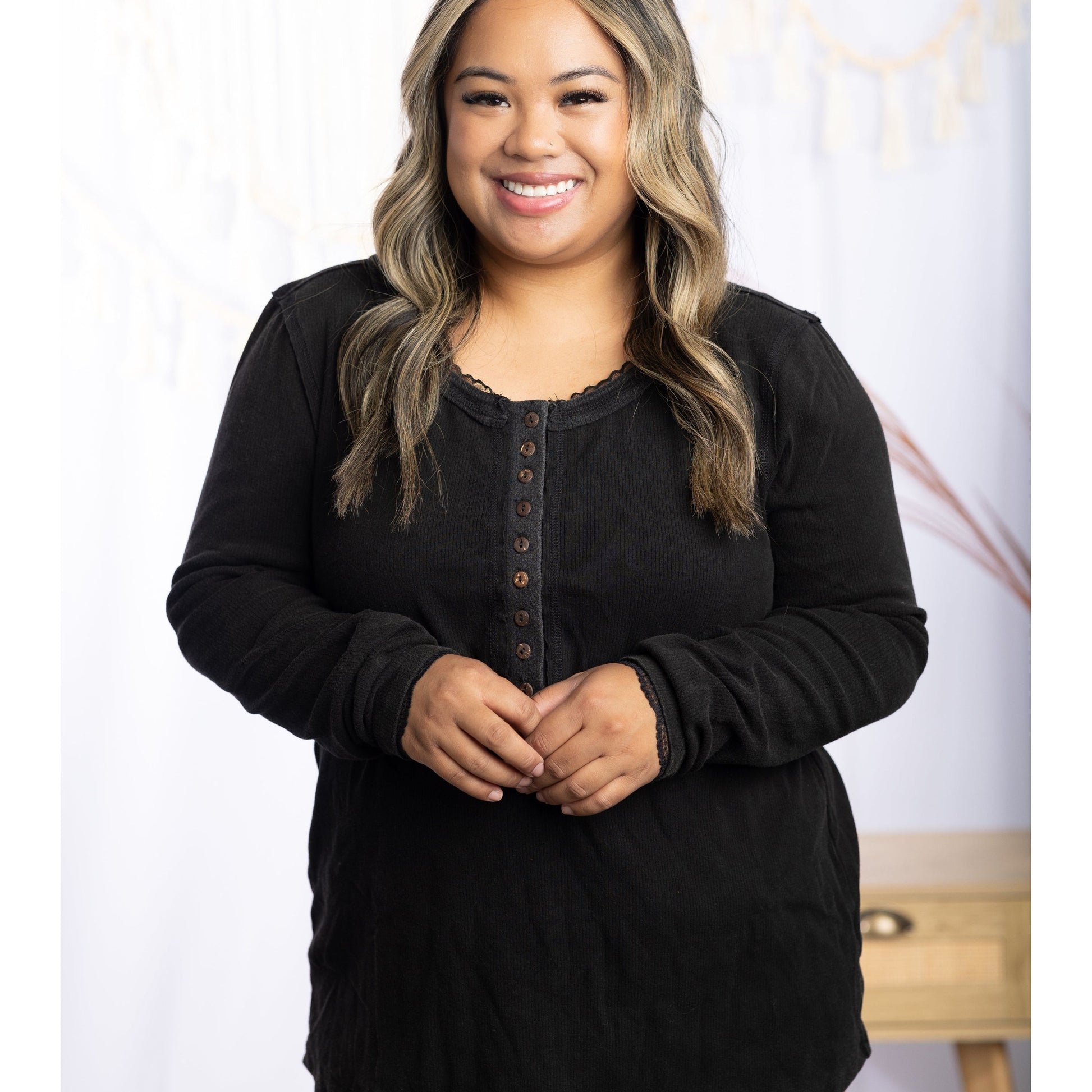 Everyone loves a henley, and this one takes the cake..it will absolutely become your forever go to piece. Made from a heavy knit fabric, this top features a scoop neck with functioning buttons, reverse stitching details and lace trim on the neck and sleeves.