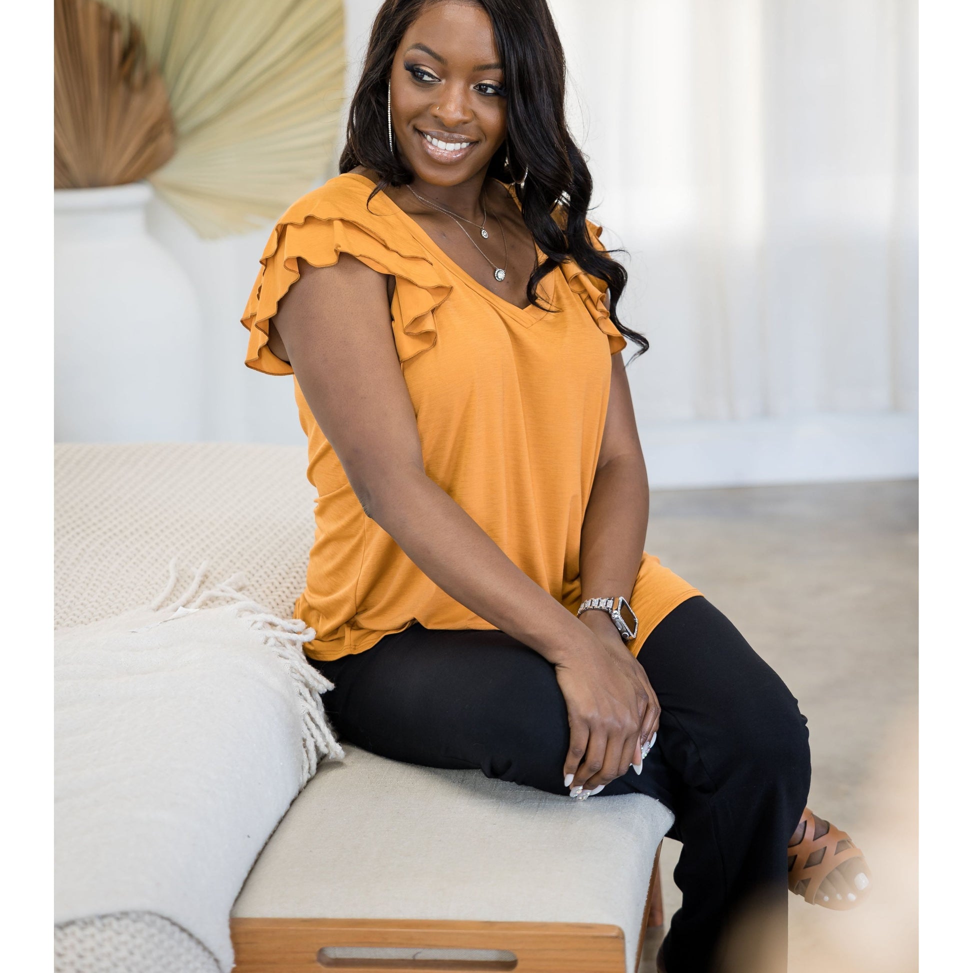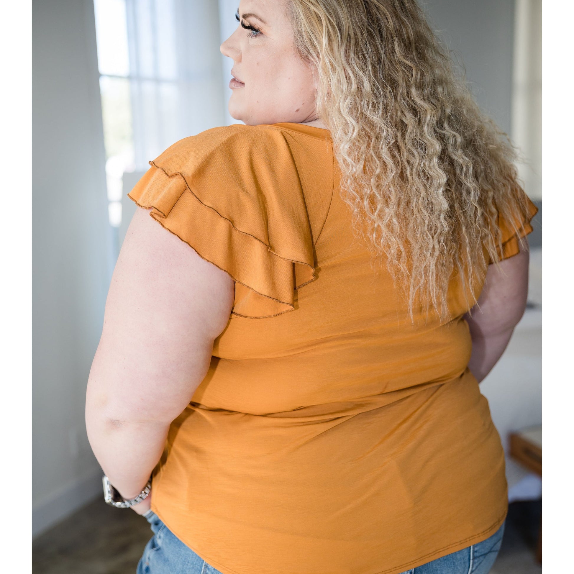 The perfect shade of camel, this double ruffle top will complete any outfit! With a relaxed fit, this top features a v-neck, short double ruffled sleeves and rounded hem.