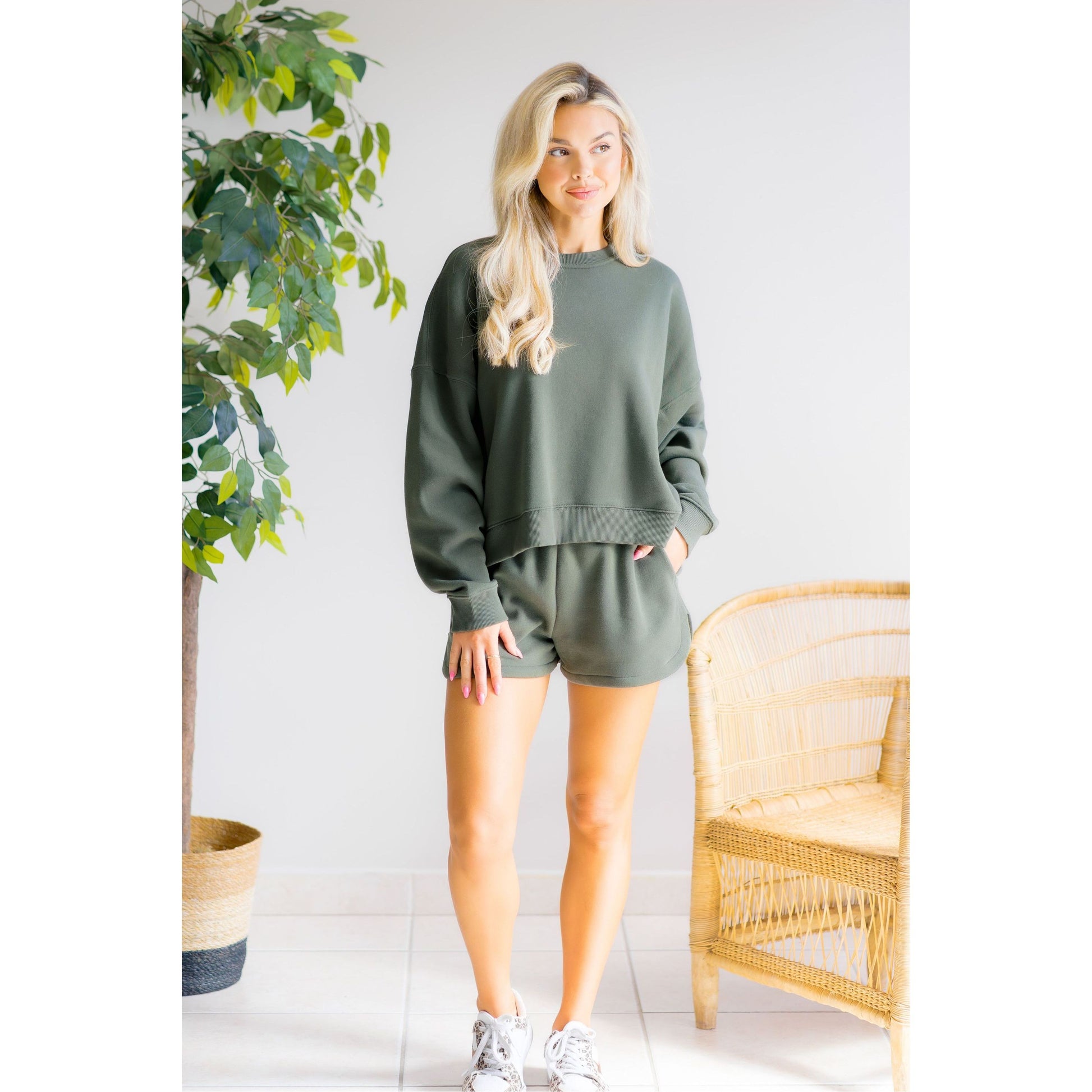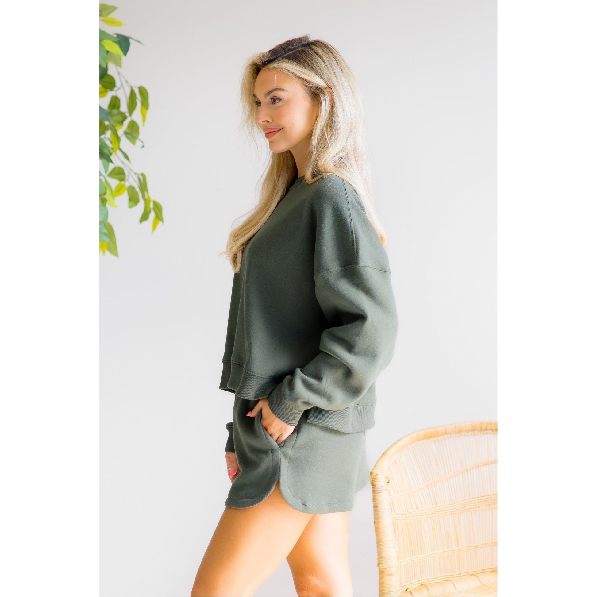 Experience cozy comfort with the Forest Whisper Set, featuring a soft fleece long sleeve sweatshirt paired with elastic waistband shorts. Designed for effortless wear, the shorts include convenient side pockets to keep essentials close. Perfect for relaxing at home or casual outings, this set combines warmth and practicality in a stylish way.