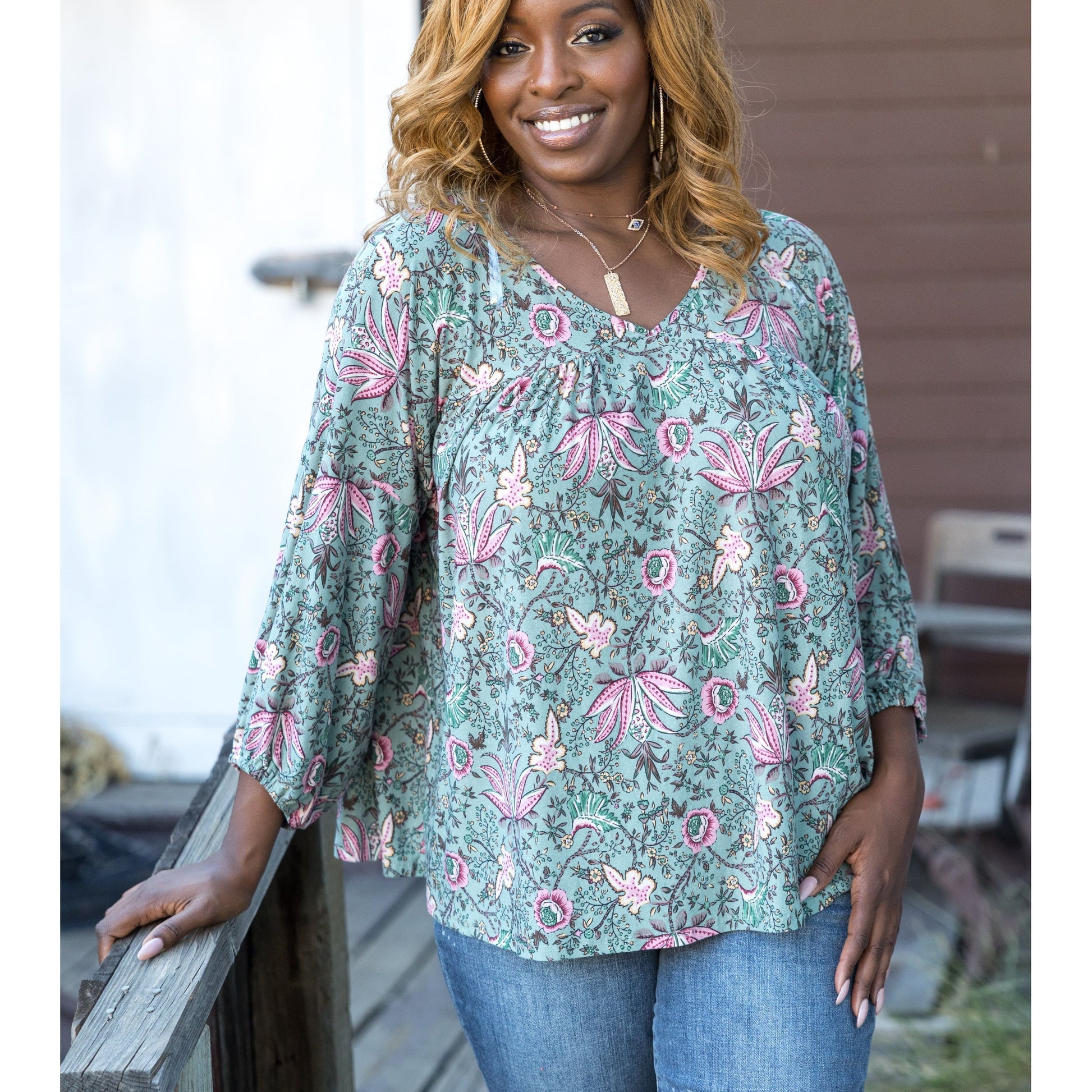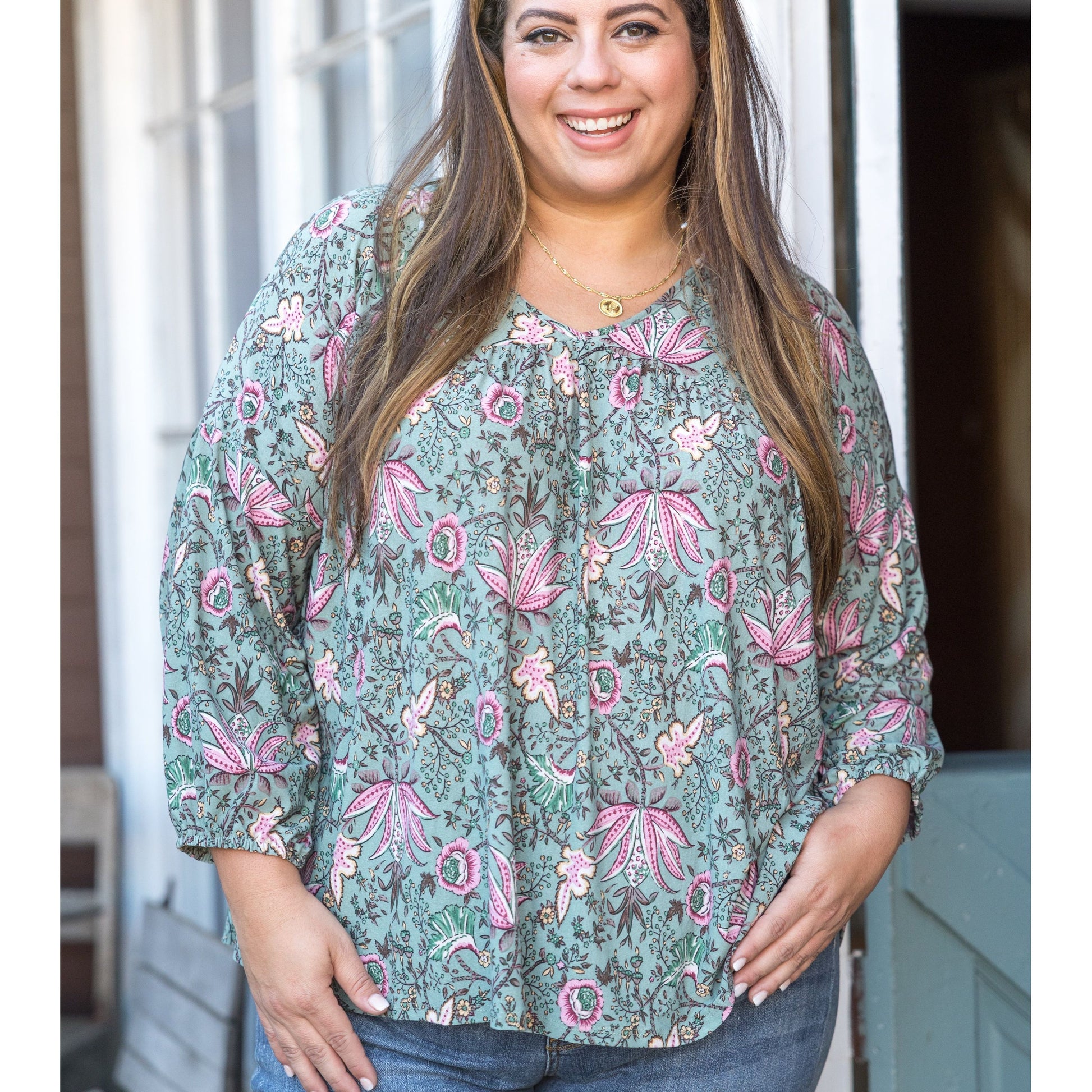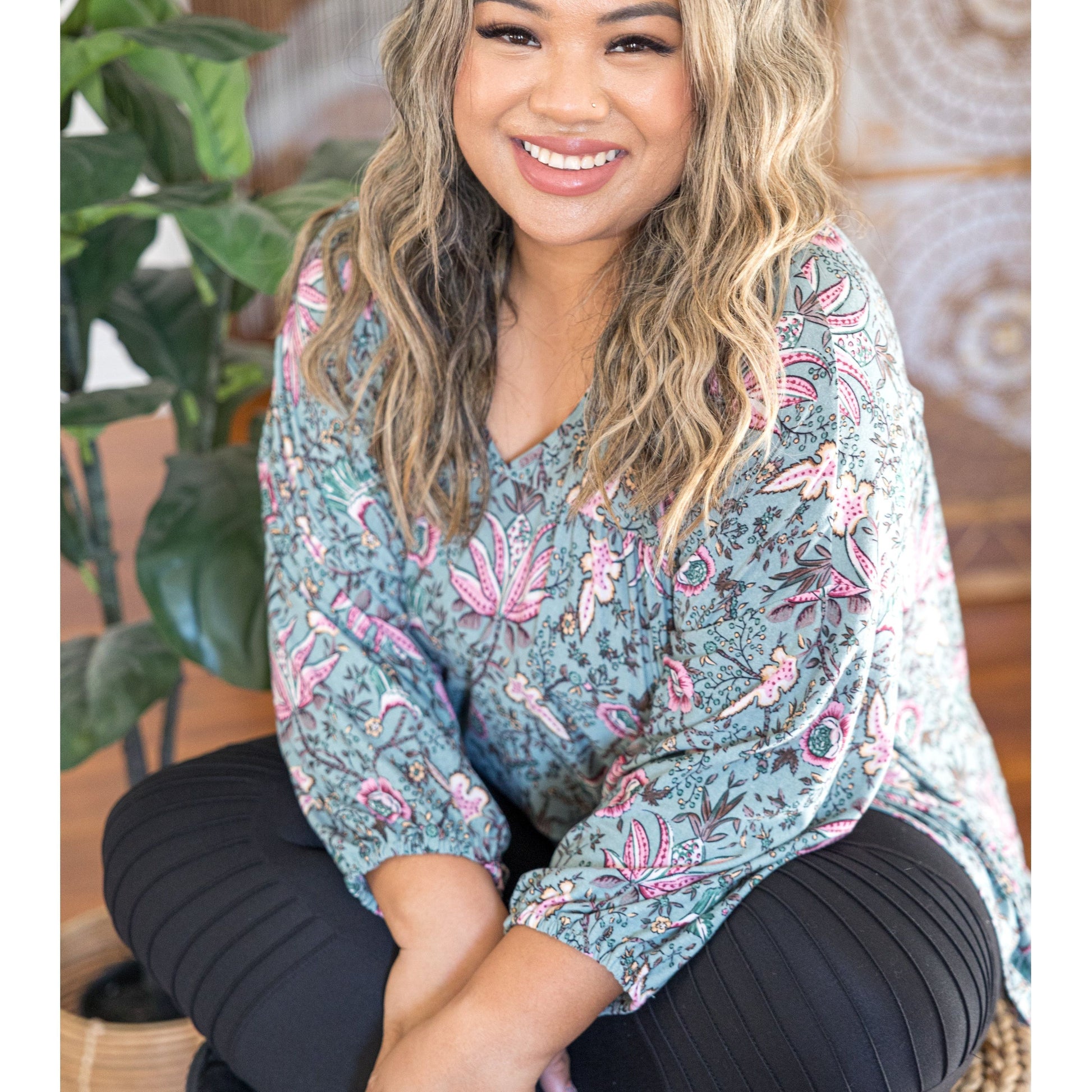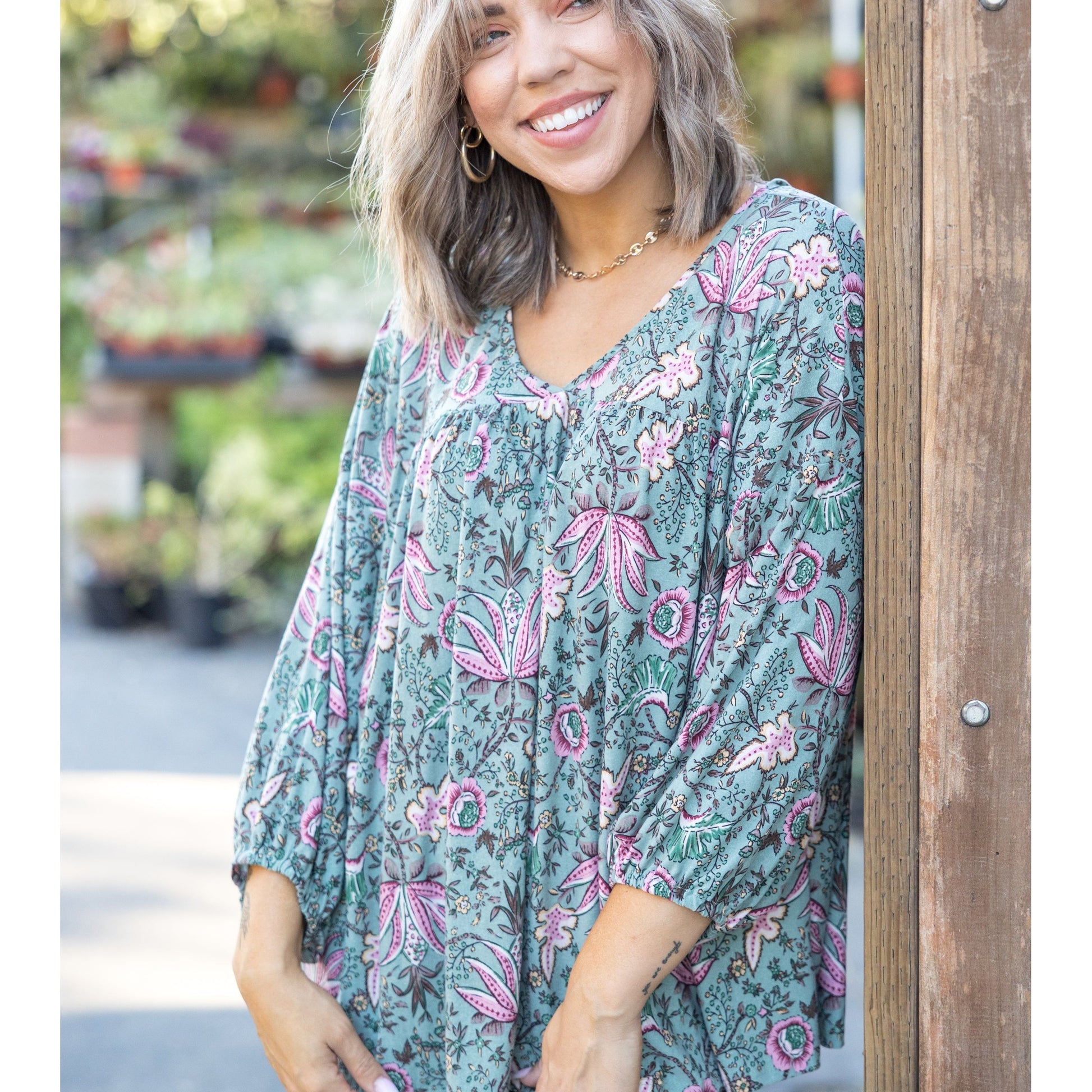 This taupe babydoll is made from the softest brushed fabric, just wait till you feel it! With a relaxed fit, this top features a v-neck, long balloon sleeves and a rounded hem.
