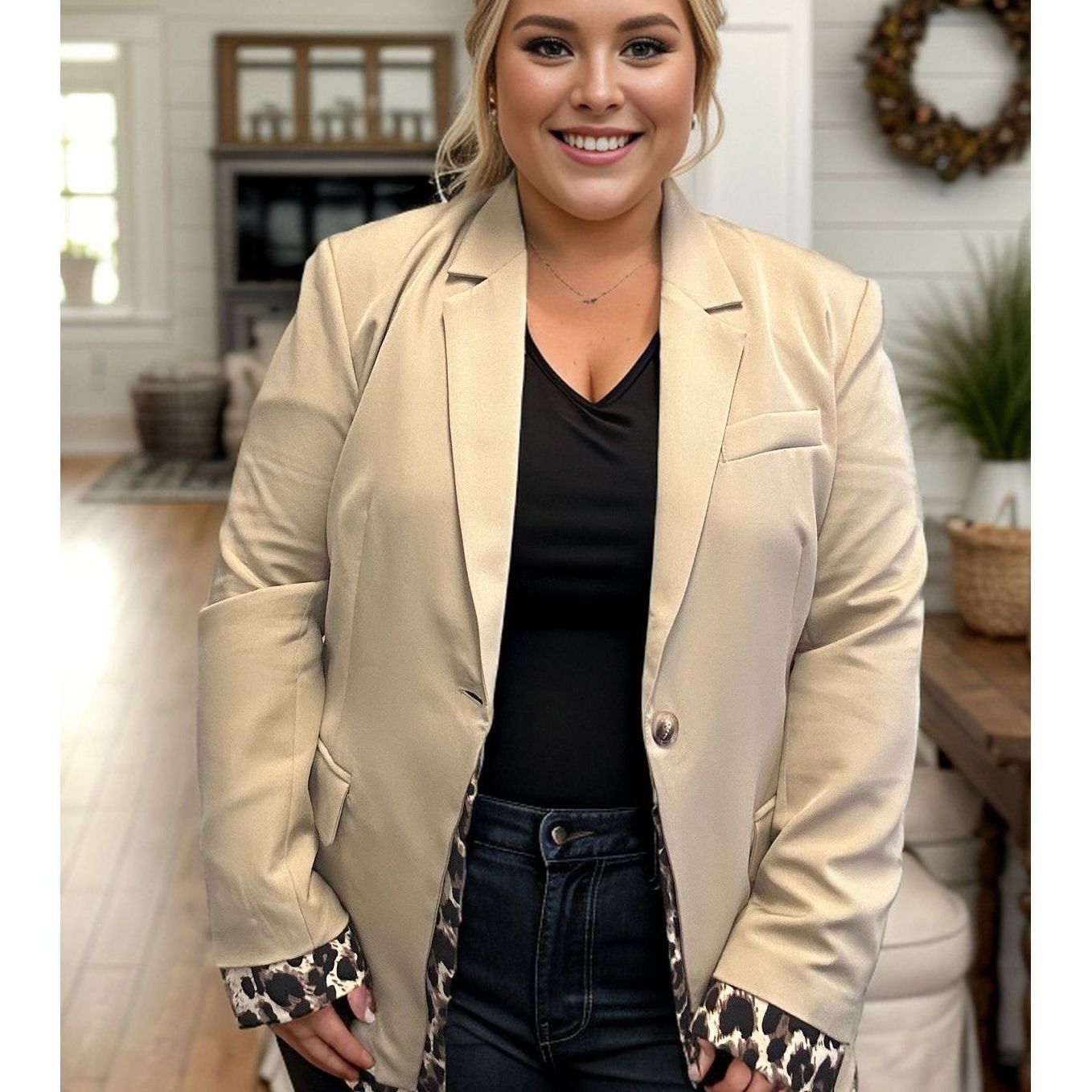 Get ready to do business in the wild with our Jungle Business Blazer! This tan blazer features a playful leopard lining and trim, perfect for adding a touch of fun to your professional wardrobe. The button closure and side pockets make it both stylish and practical. Do blazers get any better?