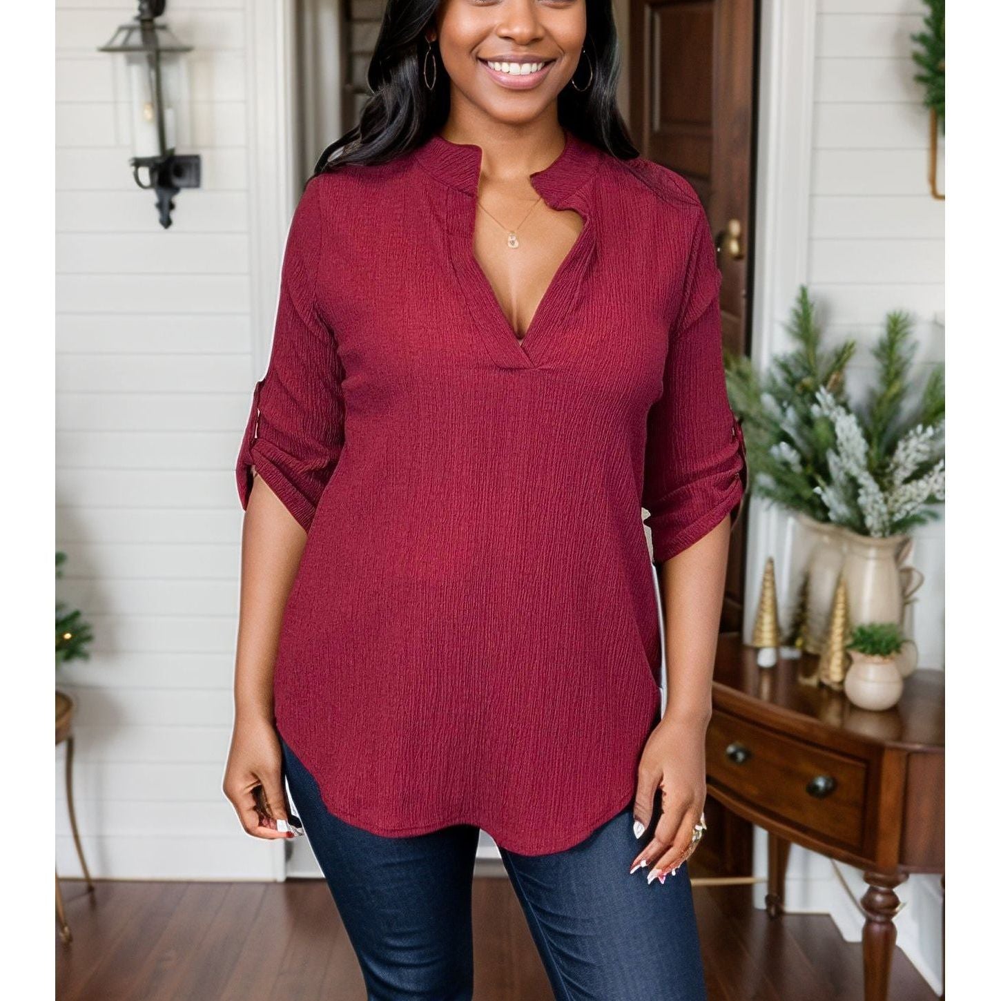 Unwind in style with Merlot Dreams - Gabby. This v-neck top features a mandarin collar and three quarter sleeves, perfect for any occasion. The gold button details and textured fabric add a touch of elegance to your wardrobe. Cheers to fashion!
