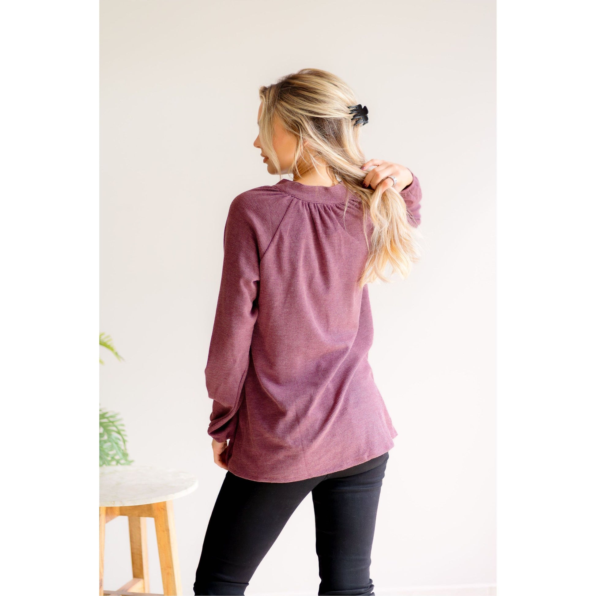 Enjoy year-round warmth with the Mulberry Moon Thermal Top, made from a soft thermal knit that provides cozy comfort. Its relaxed silhouette combines effortless style with a v-neck and mandarin collar for a touch of refined elegance. Featuring long sleeves and a flattering rounded hem, this top is a versatile and fashionable addition to any wardrobe. Embrace both comfort and style with ease!