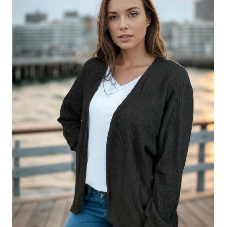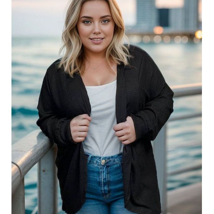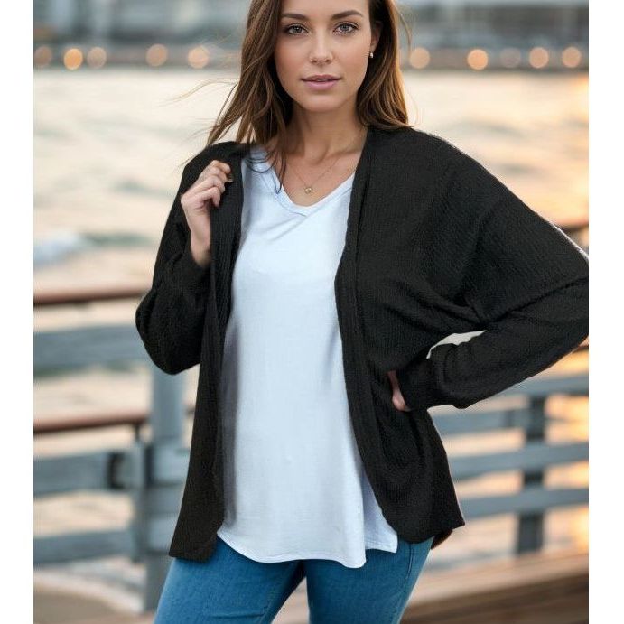 Introducing the My Savior cardigan - the ultimate Spring addition! Made with brushed waffle knit for a cozy feel and featuring a stylish open face design and round hem. This black cardigan is your go-to savior for chilly days. (Pun intended!)