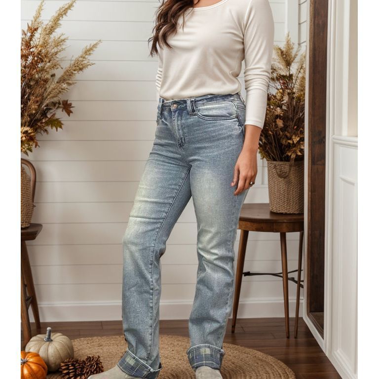 Rock your next look with these fabulously fashionable Judy Blue Jeans! They have an amazing stretch and high waist design to keep you comfy all day, plus a vintage wash and bold plaid cuff for a stylish pop of color. Cuff 'em or uncuff 'em - they're a surefire style hit, no matter what you choose!