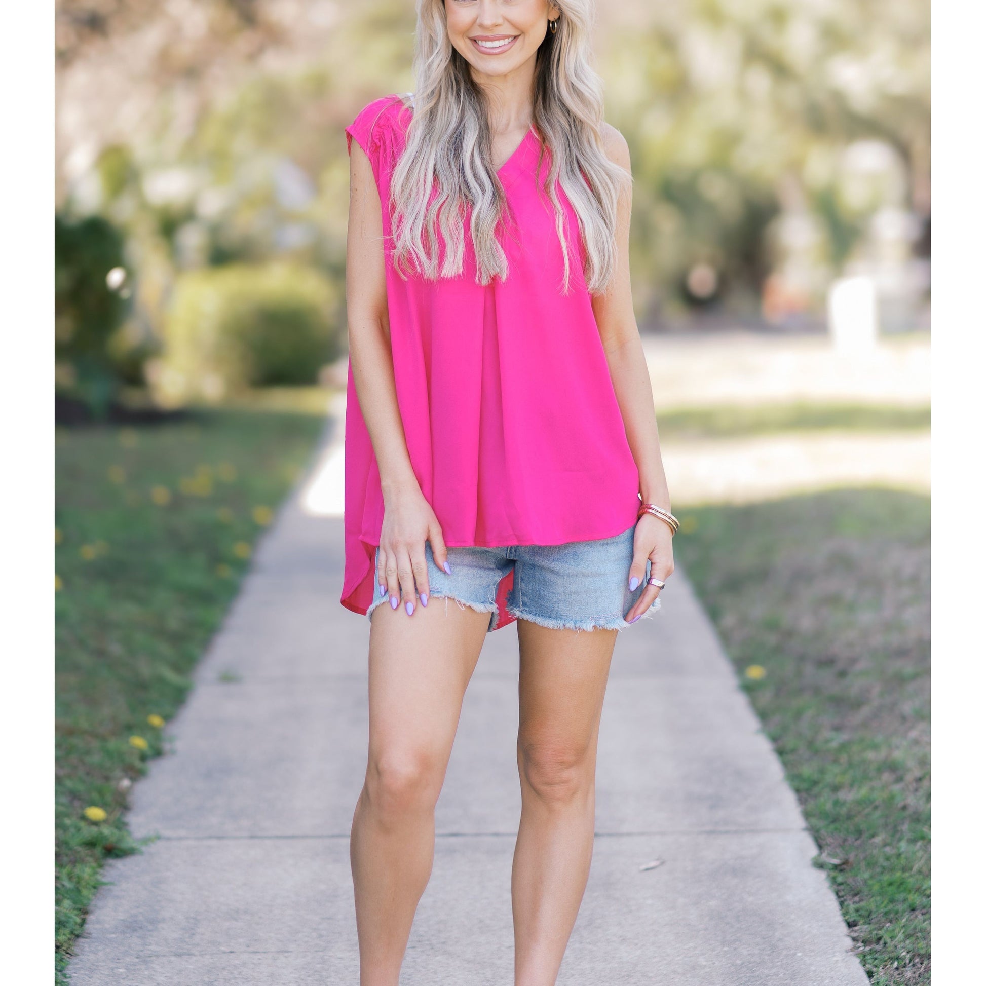 Look stylishly chic in this Pink Petals high-low blouse! This comfy woven number flaunts a flirtatious v-neck, ruffled detail, and relaxed fit so you can rock it day or night. Get ready to make heads turn with every "high" and "low" style move!