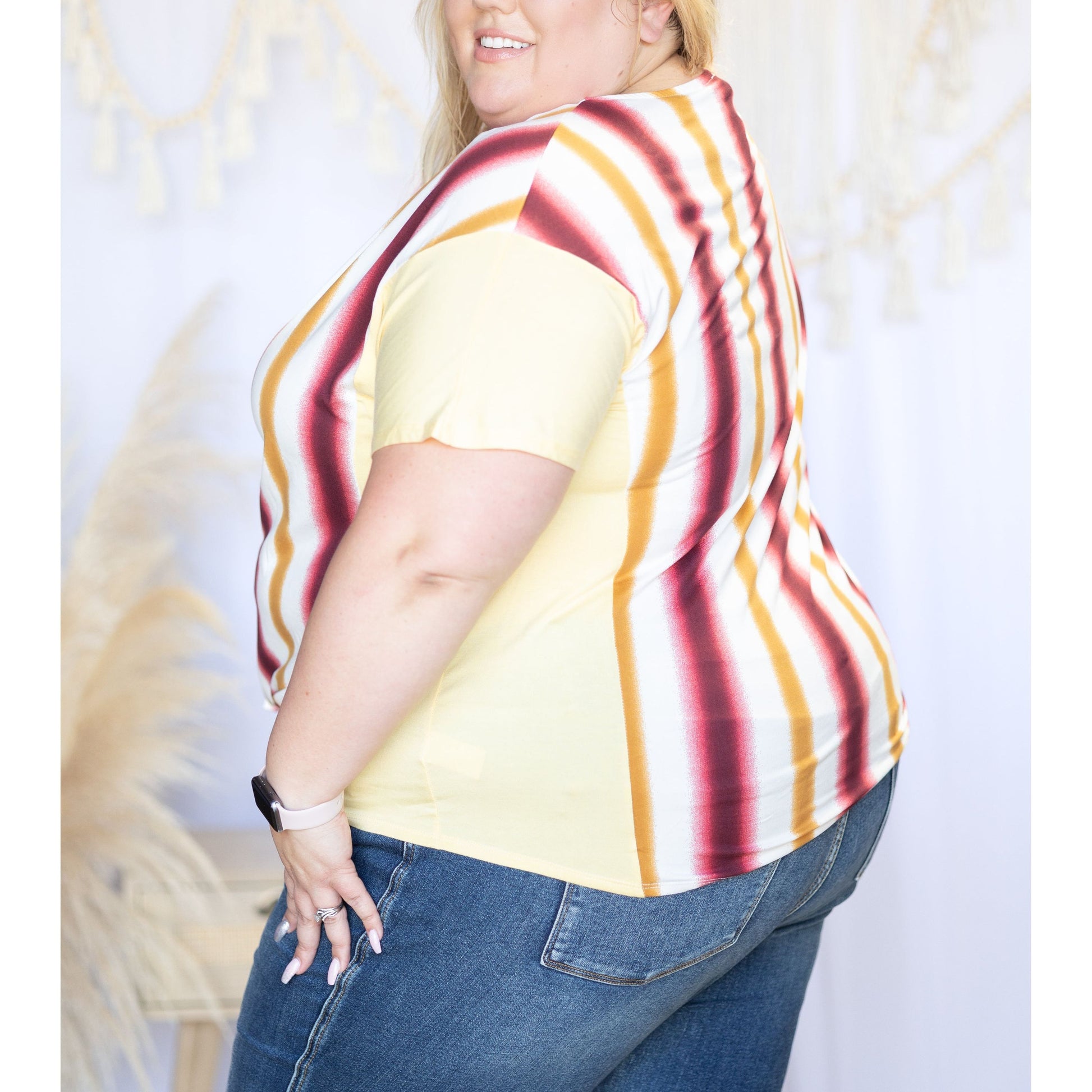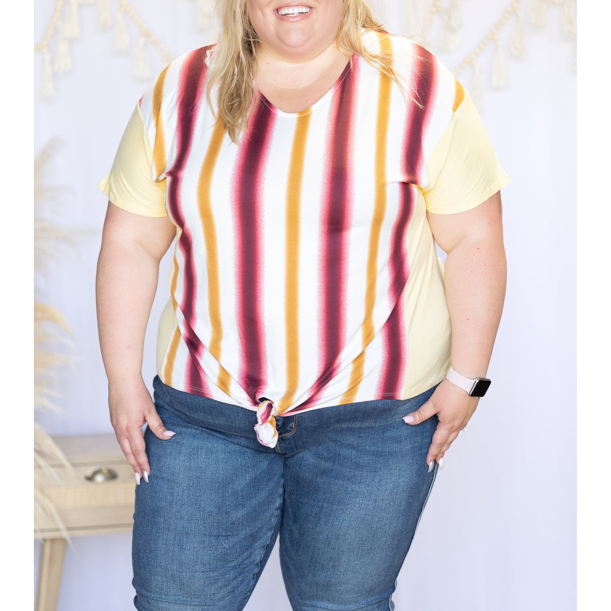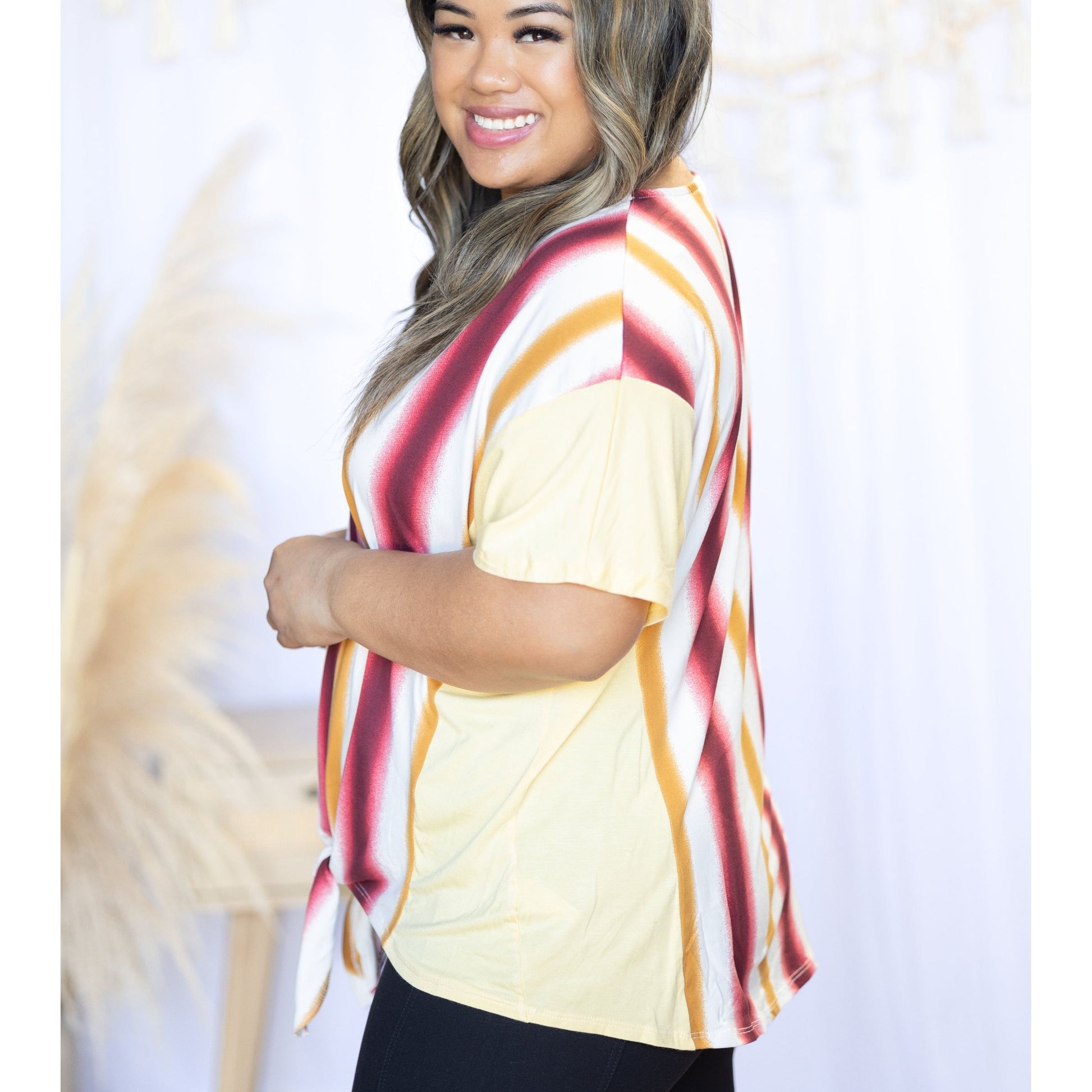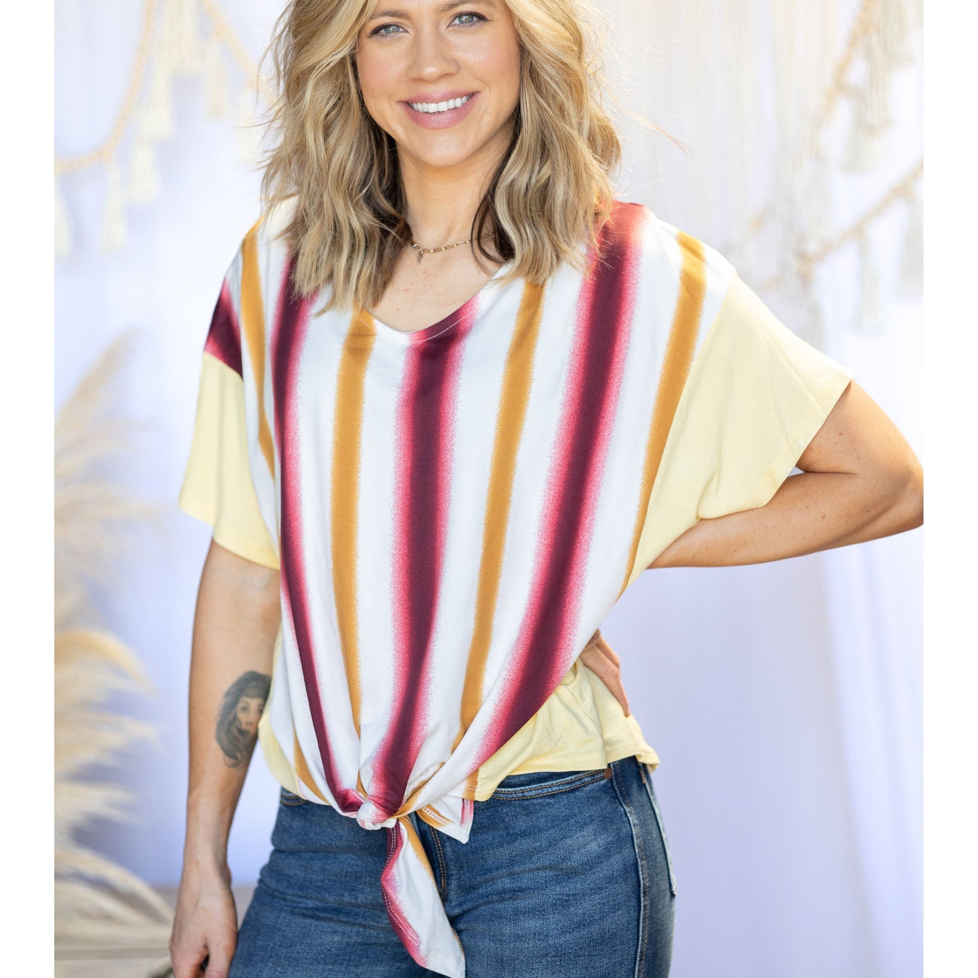 Let your style shine! Rays of Love short sleeve can keep your warm-weather looks humming, featuring a tied front, vertical stripes, a relaxed fit, and a v-neck. Rock this effortless-cool look with confidence and add some stripes to your wardrobe!