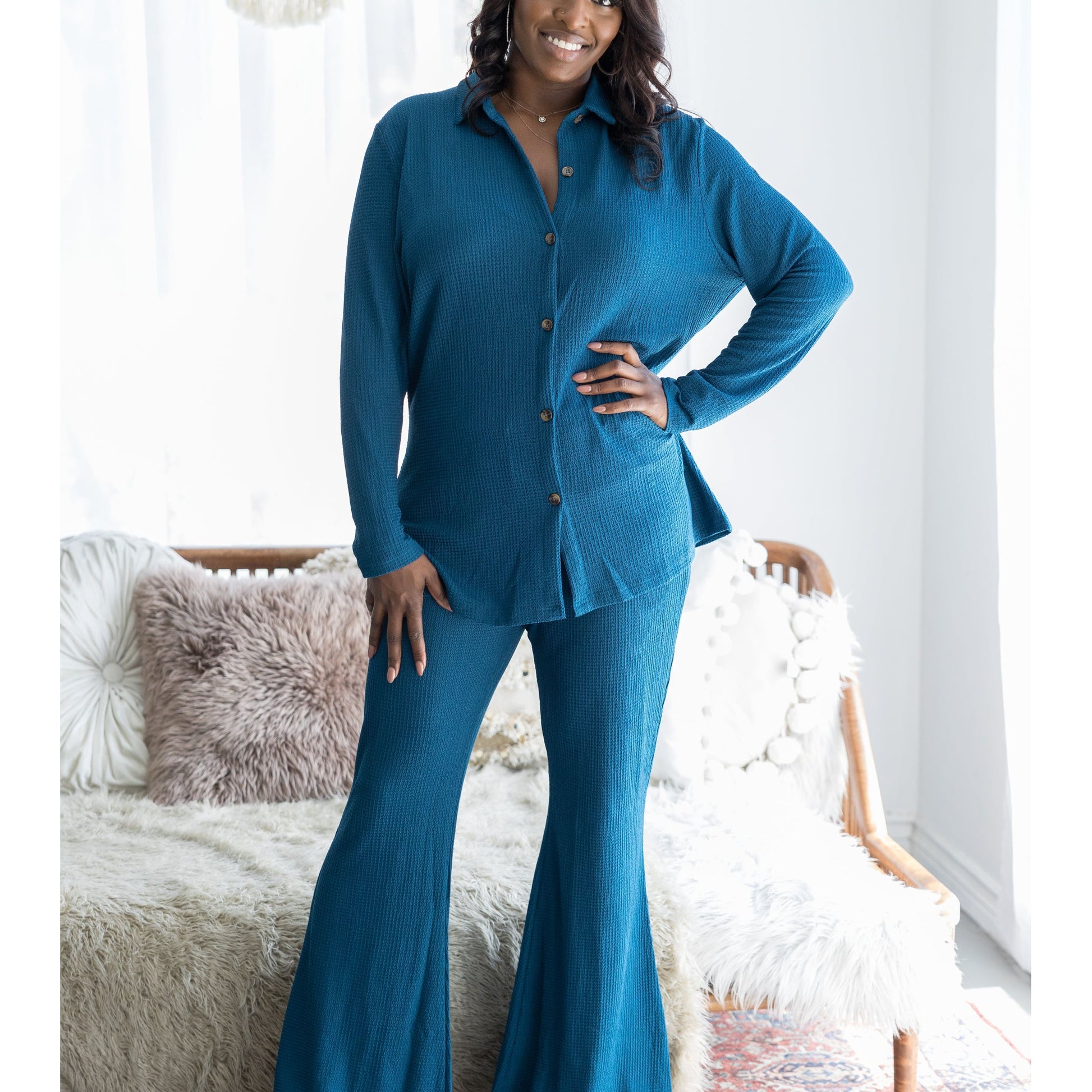 These stylish and comfortable bell bottoms are perfect for just about any occasion. Made from a soft waffle knit, these bottoms features an elastic waist band.