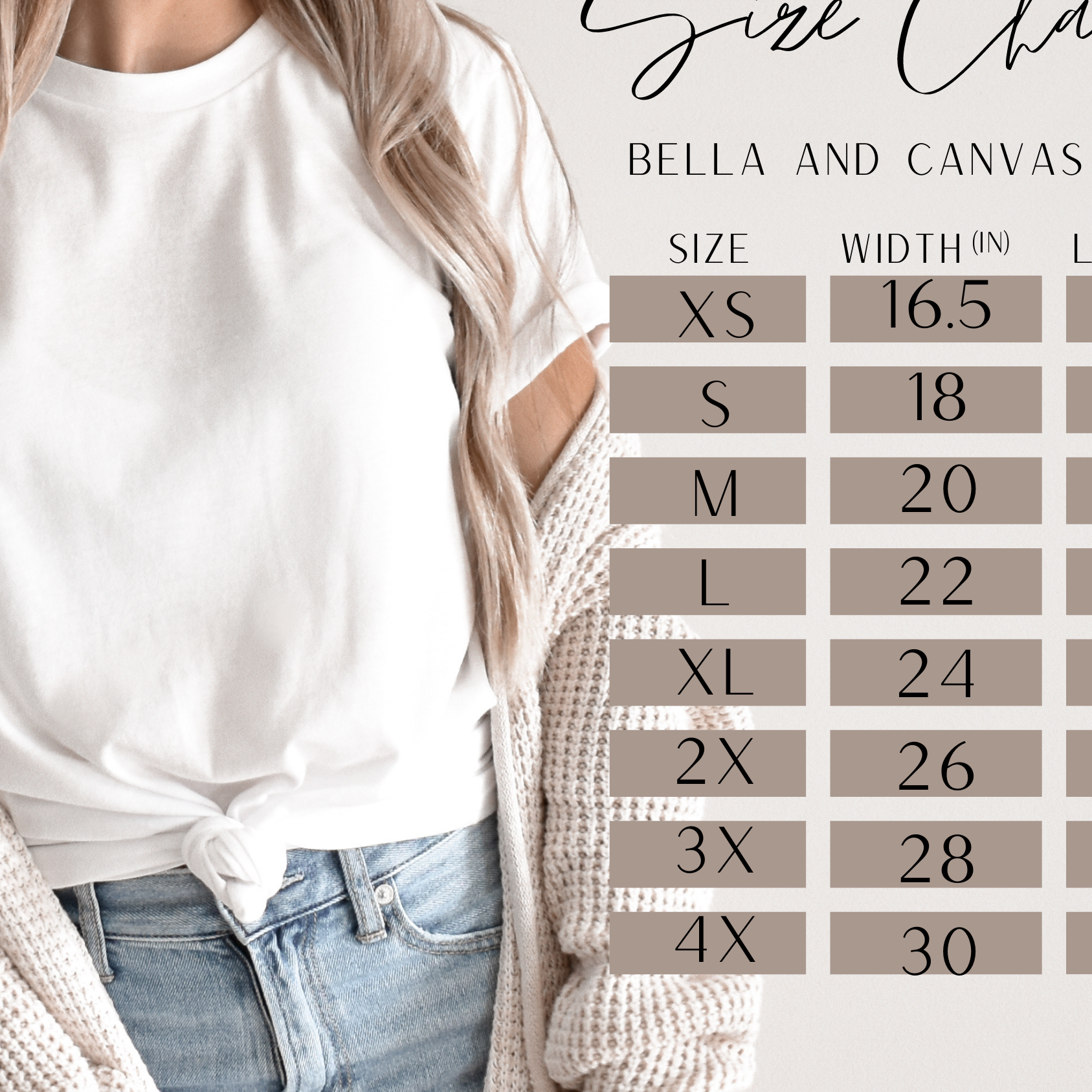 - Bust: S (18"), M (20"), L (22"), XL (24"), 2X (26"), 3X (28"), 4X (30")
