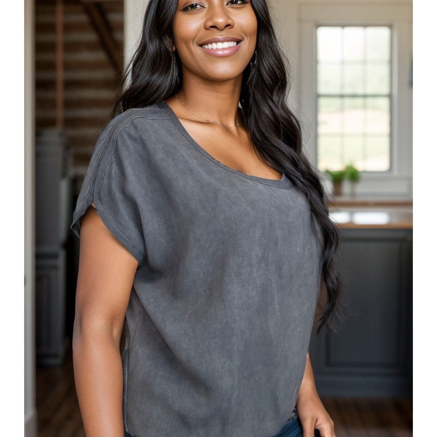 Sizzle in style with the Smokey Evenings short sleeve. This playful top in charcoal grey features a flattering scoop neck and banded hem for a casual yet chic look. Made from comfortable woven fabric, it's perfect for any occasion. (No need to stay in on warm nights.)