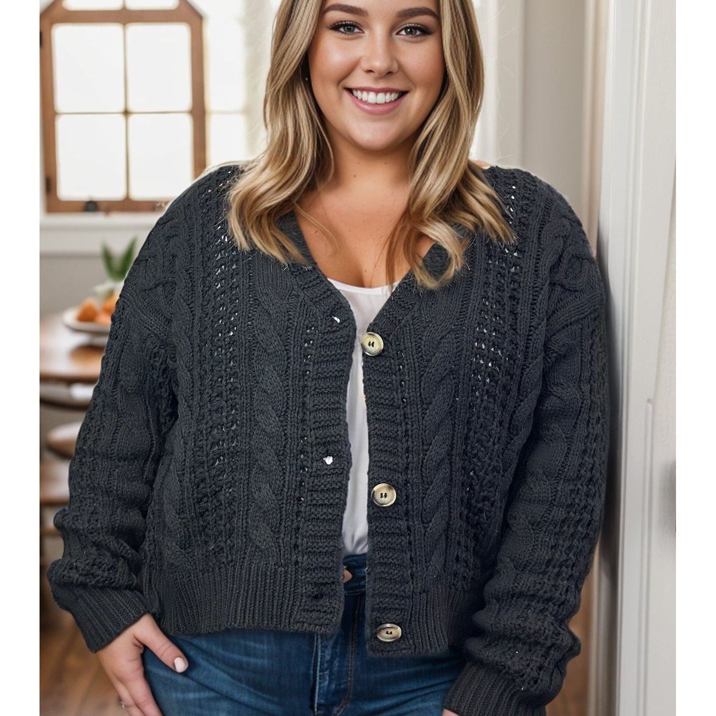 Stay cozy and stylish with The Essential Cable Knit Cardigan. Its cable knit design adds a touch of texture, while the cropped length and button closure give a trendy twist. Keep warm in cool weather with its long sleeves and snuggly, solid black fabric. Perfect for any outfit!