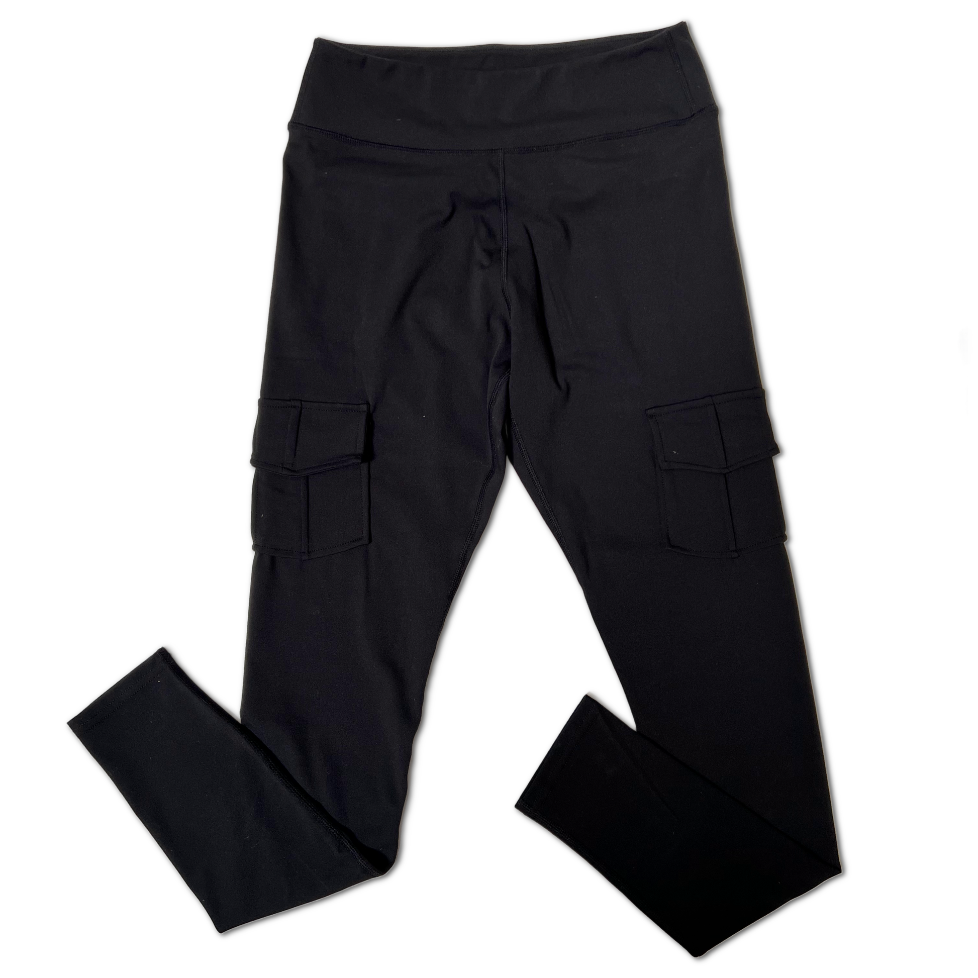Unleash your inner fashionista with our Total Package Leggings. These high-waisted leggings feature a yoga band for ultimate comfort and a flattering fit. Made with buttery soft fabric, they also have convenient side and back cargo-style pockets. Available in classic solid black, these leggings are a must-have for any wardrobe.