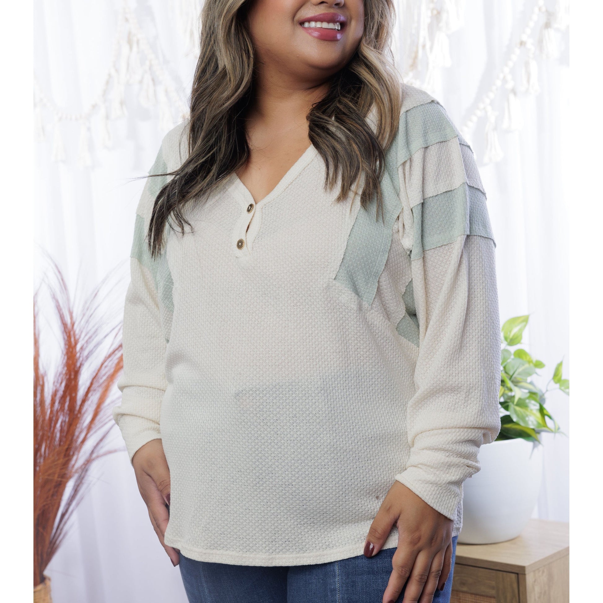 This pullover takes versatility to the next level with its unique mix of features! From the double shoulder stripe to the v-neck with button detail, you won't know which feature to flaunt first! And with its relaxed fit and long puff sleeves, you'll be comfortable and chic no matter what the occasion!
