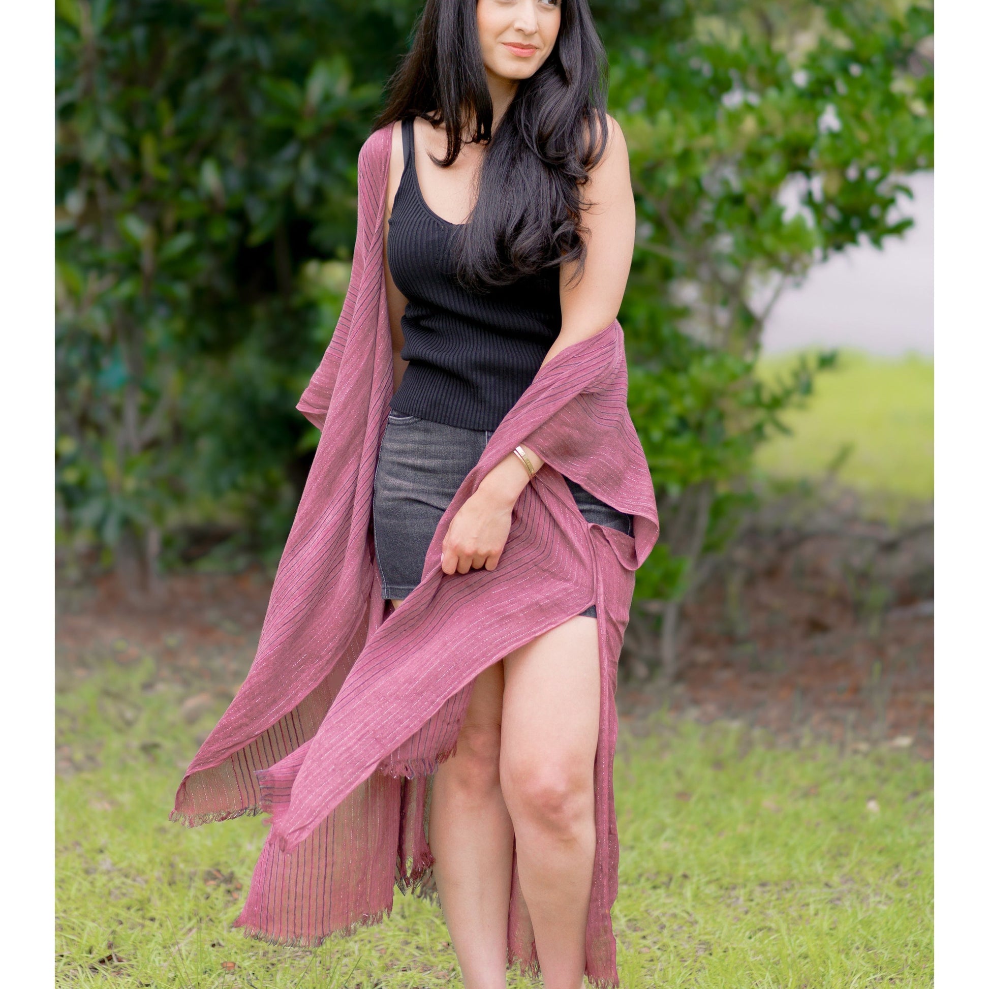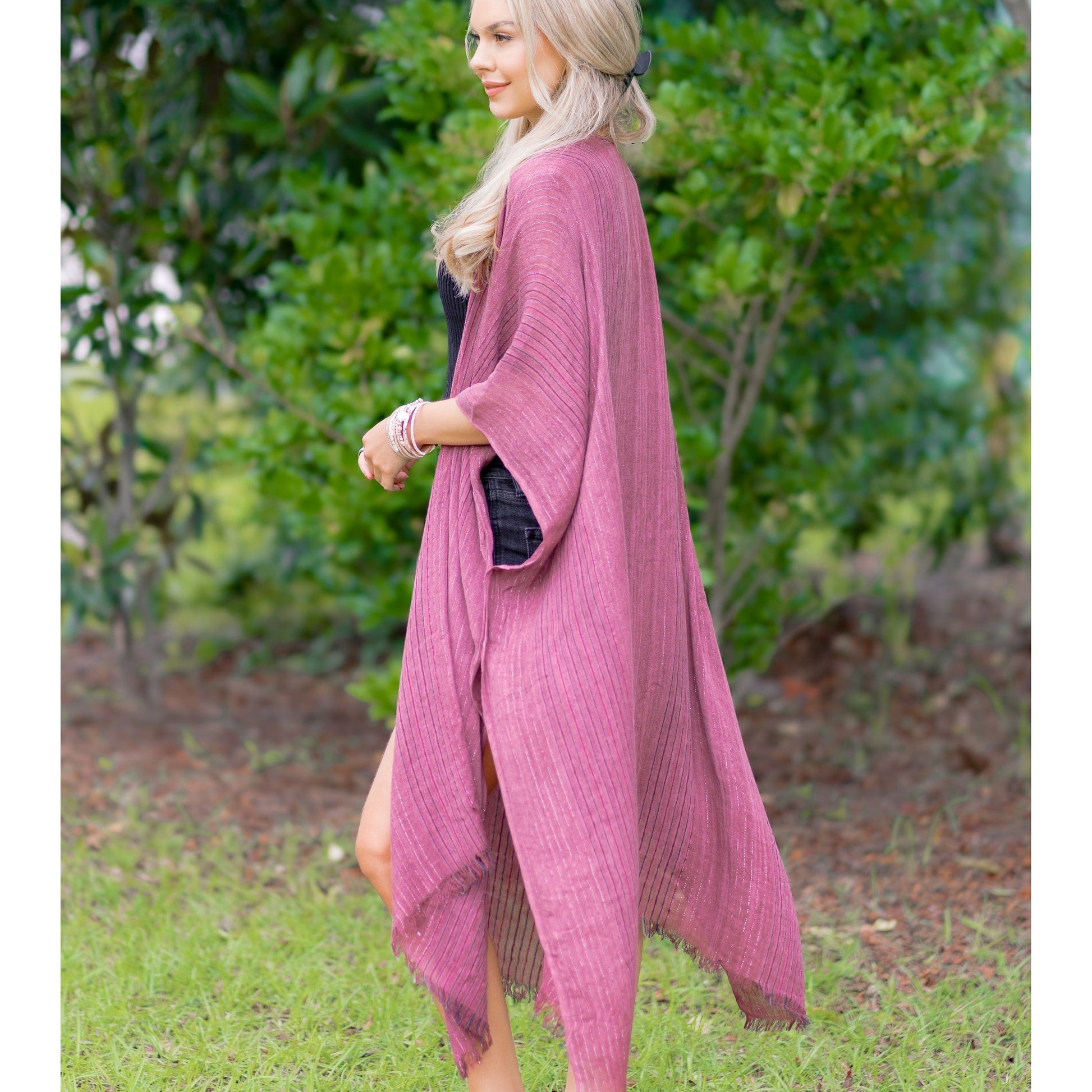 Indulge your wanderlust with our playful Wanderlust Kimono! This lightweight kimono features a chic pencil stripe design and a hint of sparkle with lurex lining. Perfect for layering, the frayed trim adds a touch of texture. (No need to pack it, this versatile piece will go everywhere with you!)