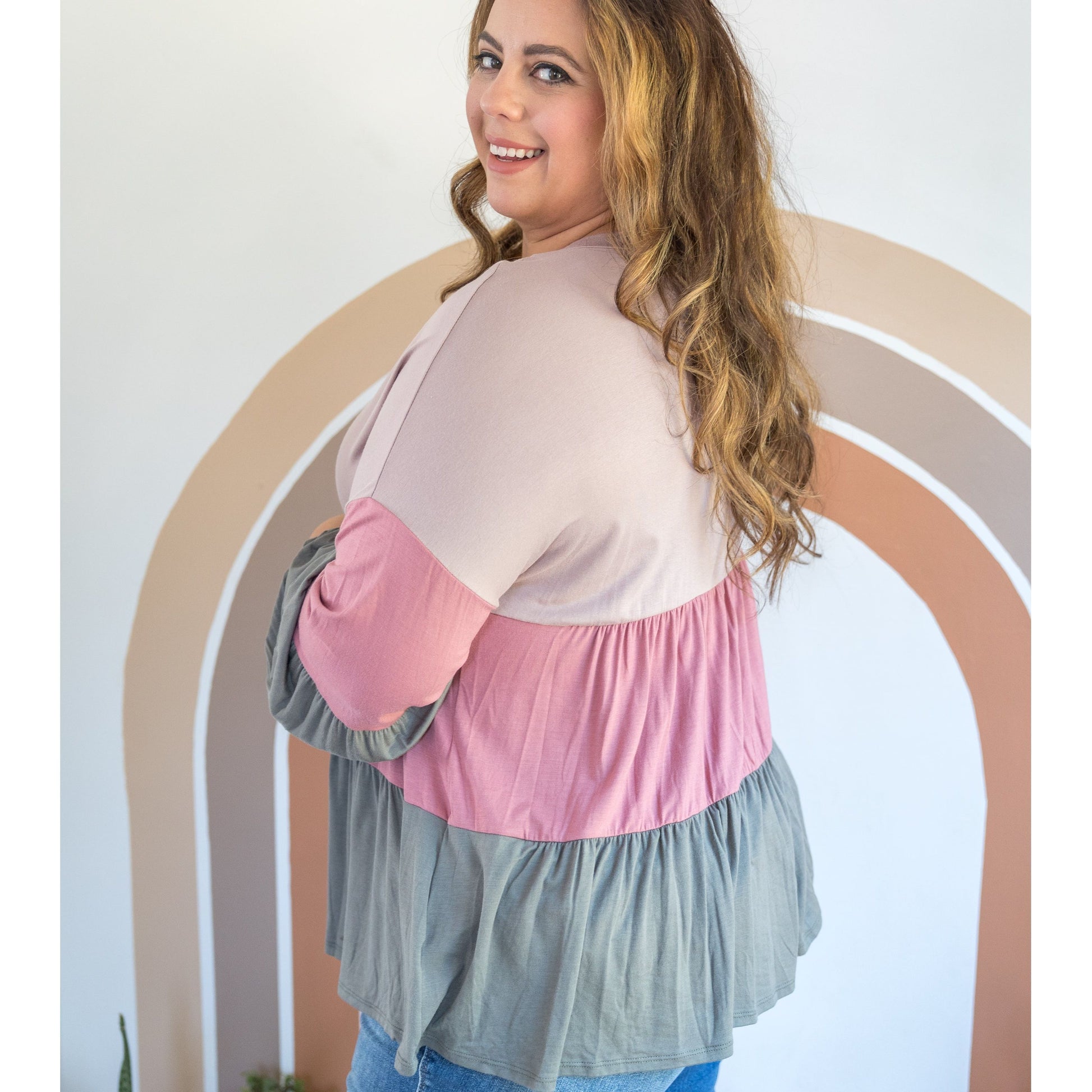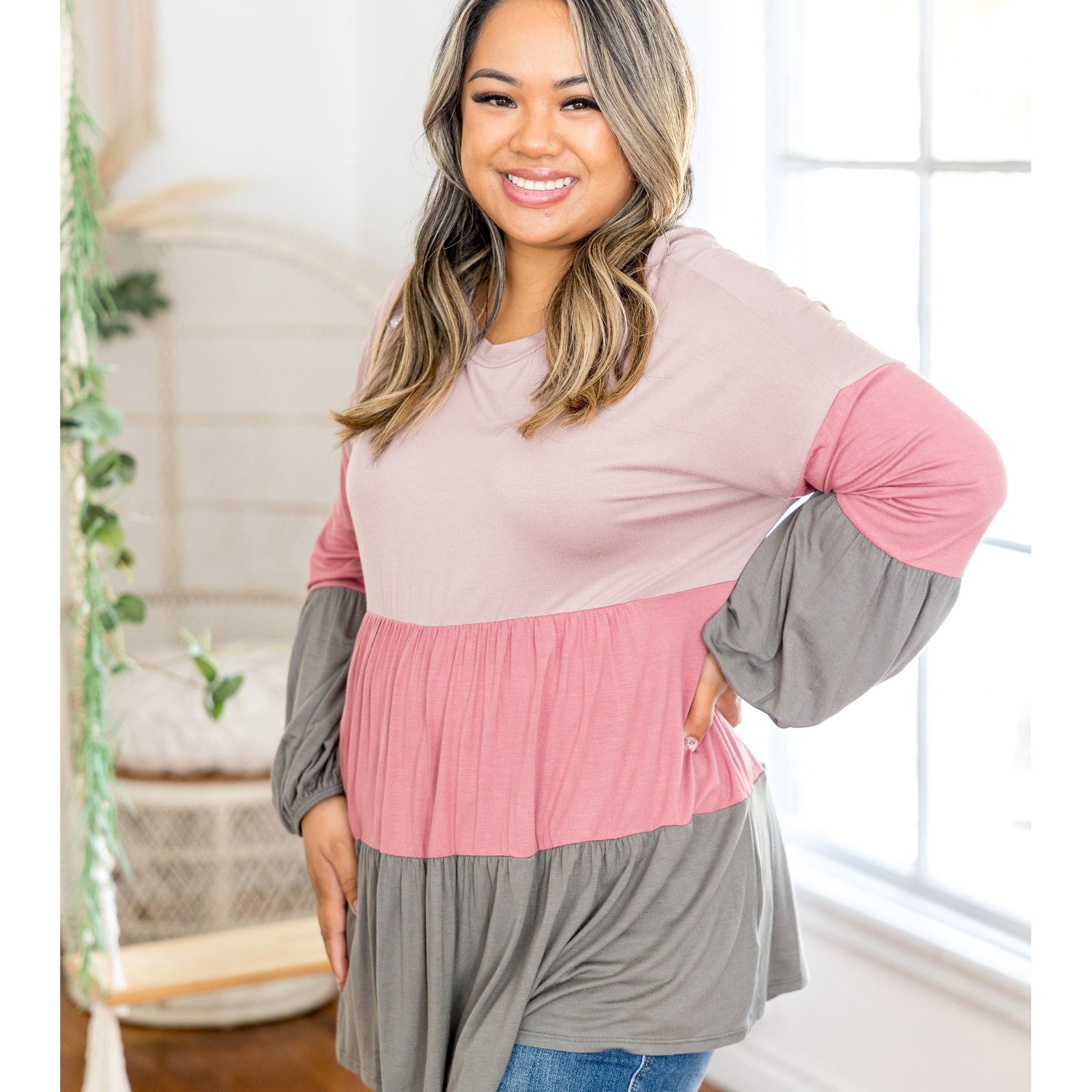 This long sleeve color block top is as sweet as watermelon sugar! With a relaxed fit, this top features a round neckline, long balloon sleeves and rounded hem.